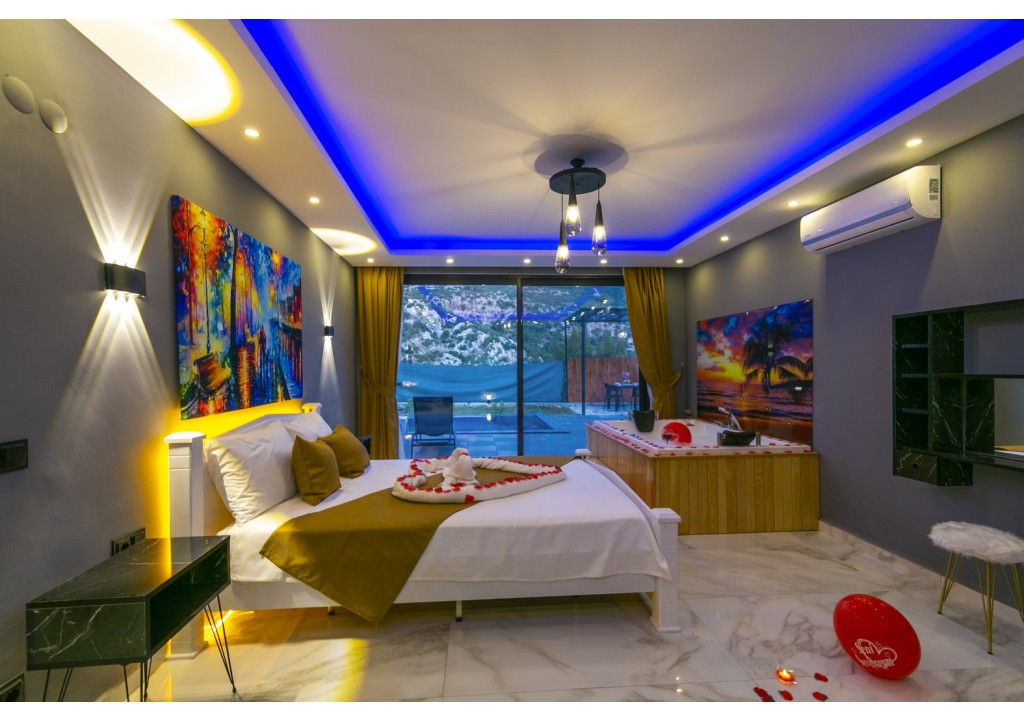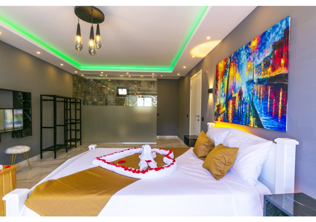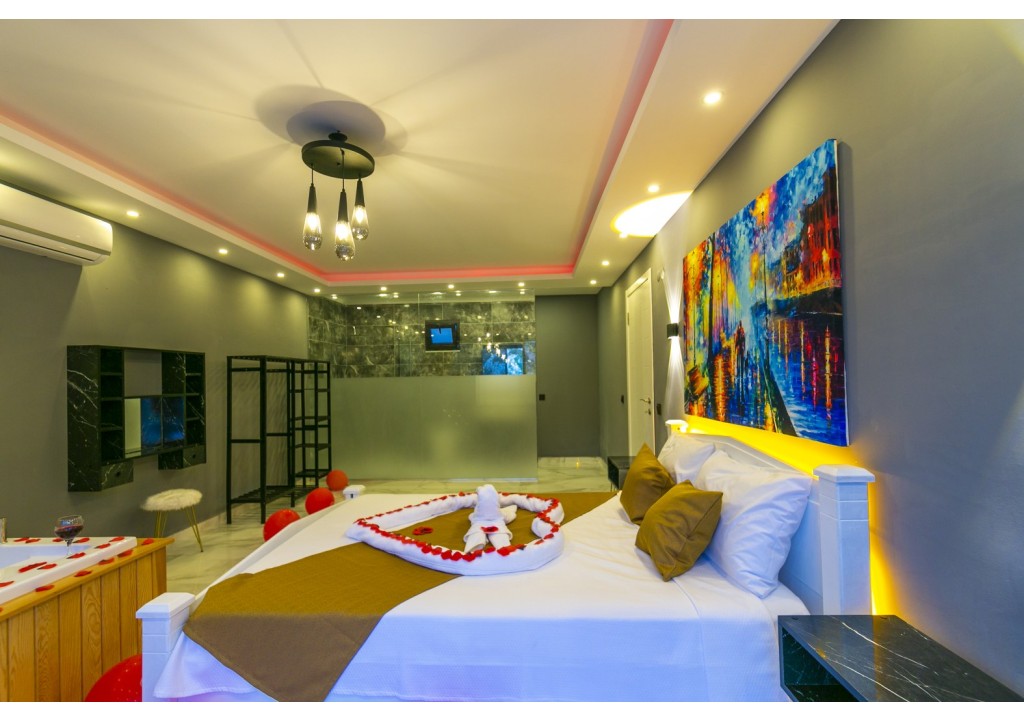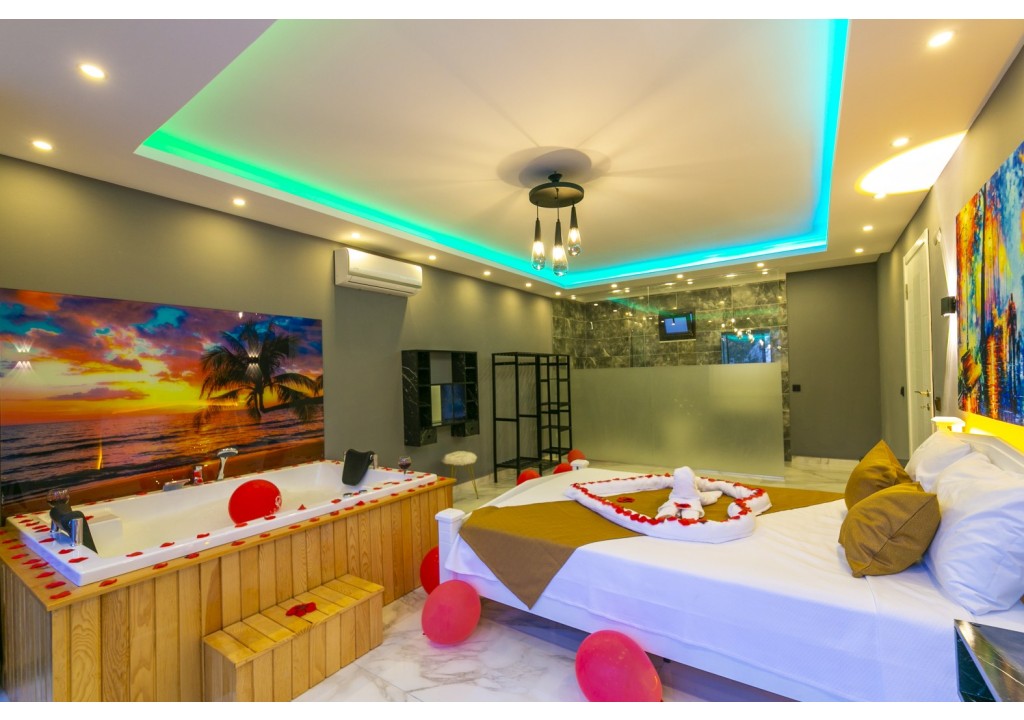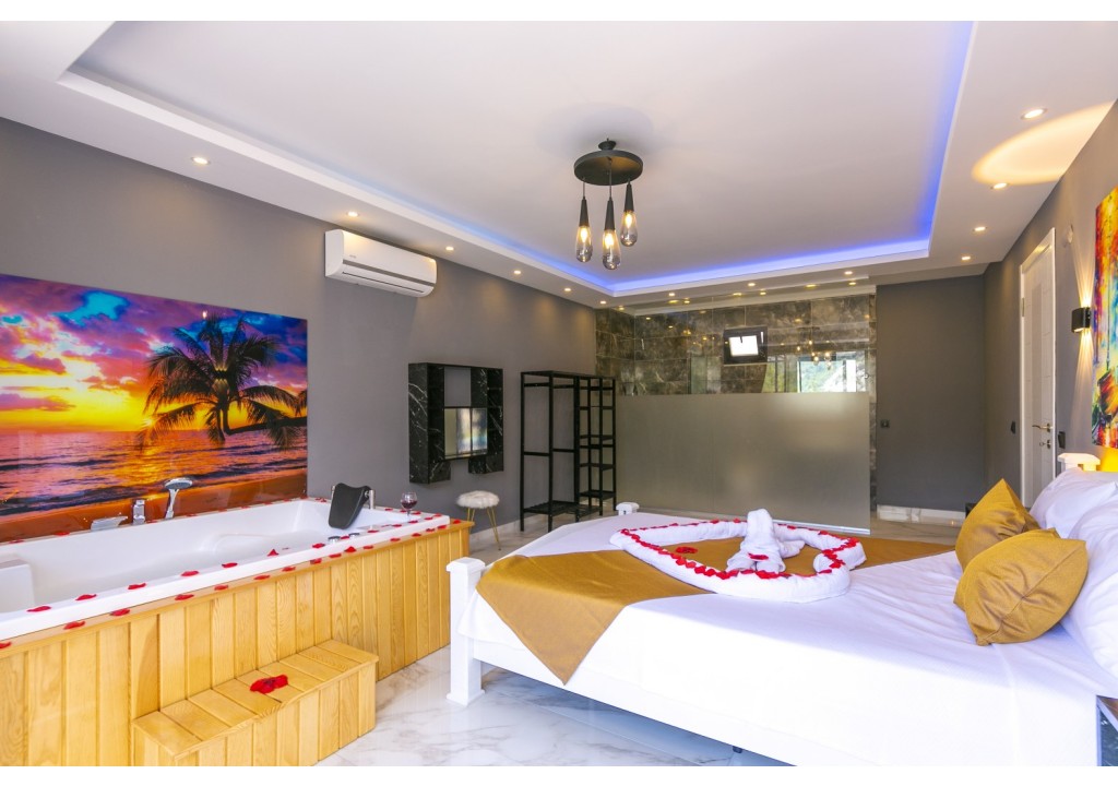 Detayları; Çift kişilik yatak, makyaj masası, komidin, klima, elbise dolabı, jakuzi, banyo ve tuvalet bulunmaktadır.