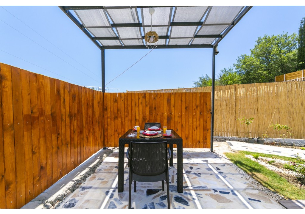 Detayları; Şezlonglar, güneş şemsiyesi, 2 kişilik yemek masası, oturma grubu.