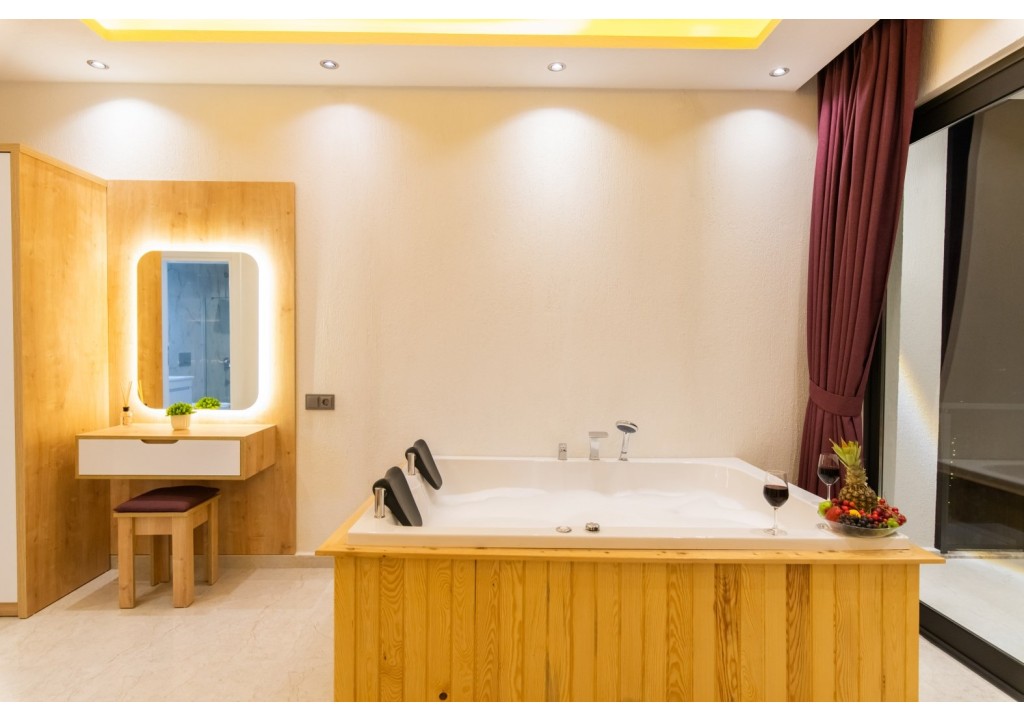 Detayları; Çift kişilik yatak, makyaj masası, komodin, klima, elbise dolabı, jakuzi, TV, banyo ve tuvalet bulunmaktadır.