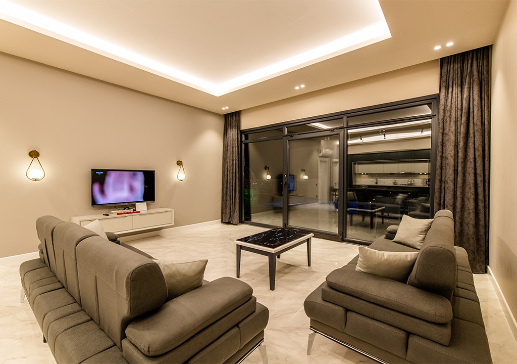 Detayları; Oturma grubu, Uydu TV (LCD), DVD Player, Klima, 8 kişilik yemek masası, Havuz terasına çıkış,