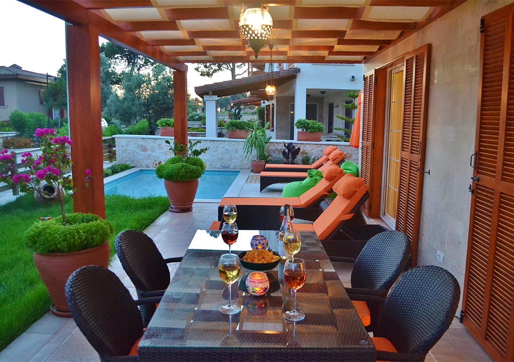 Detayları; Şezlonglar, güneş şemsiyesi, 6 kişilik yemek masası.