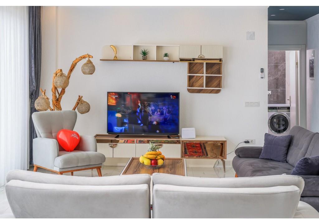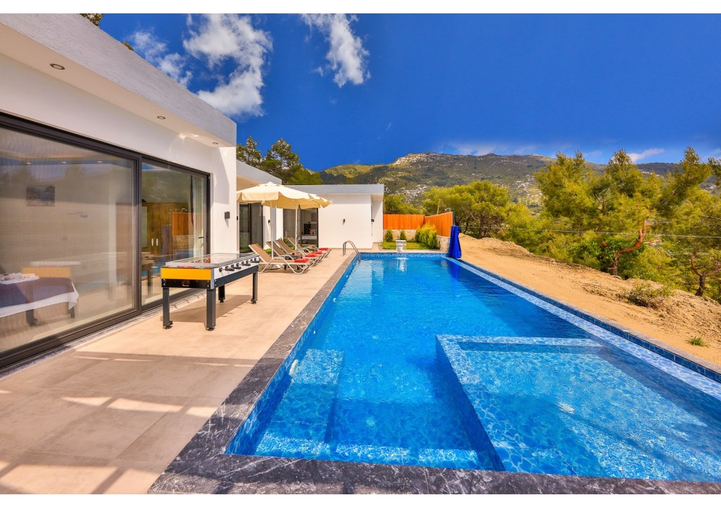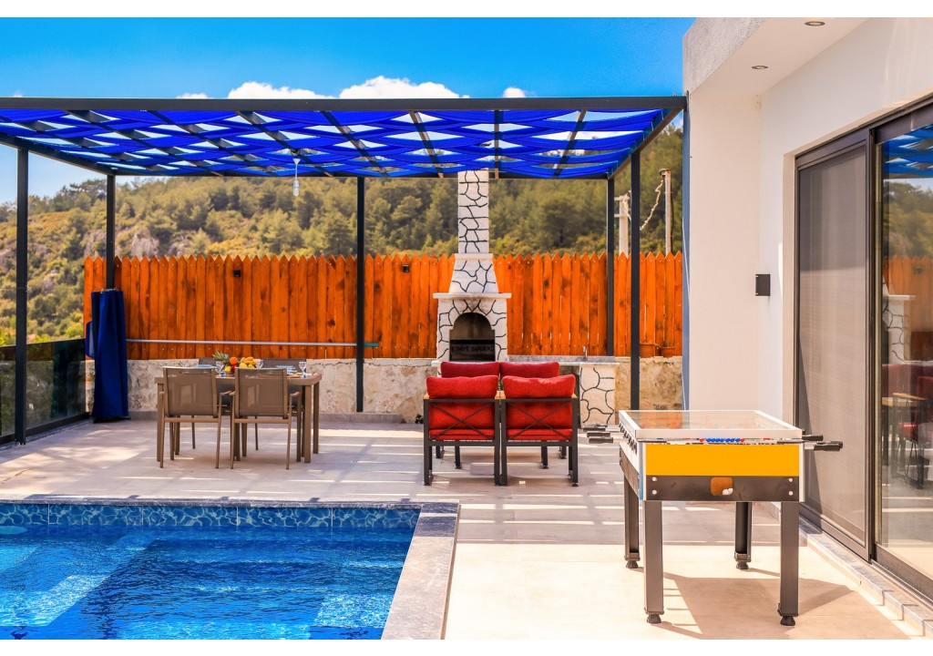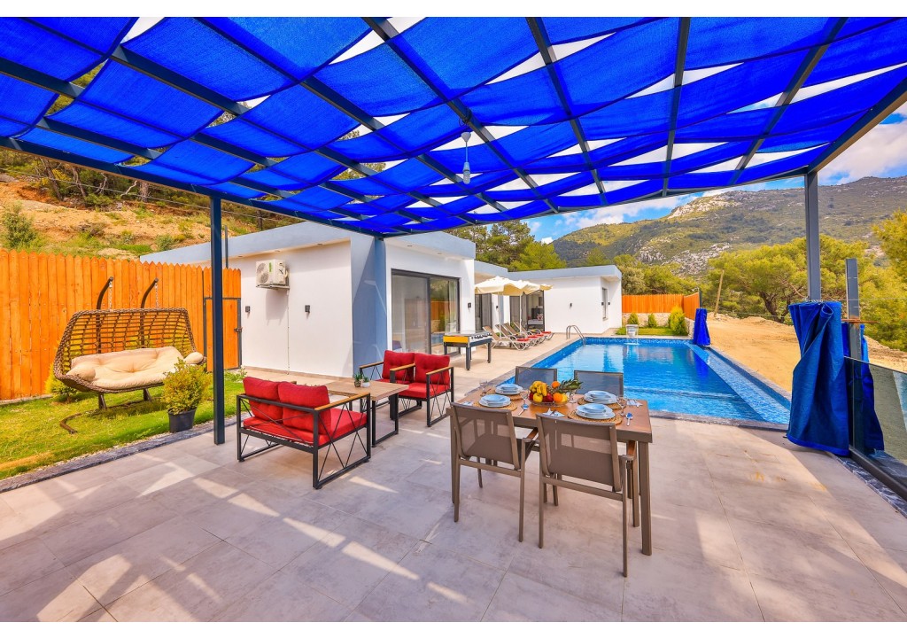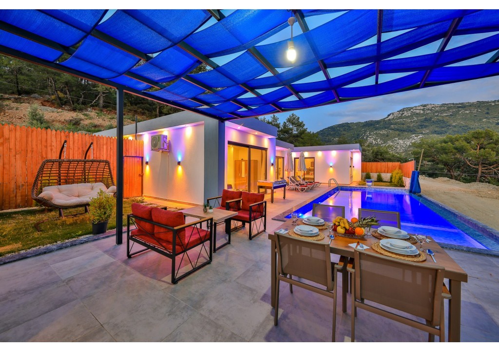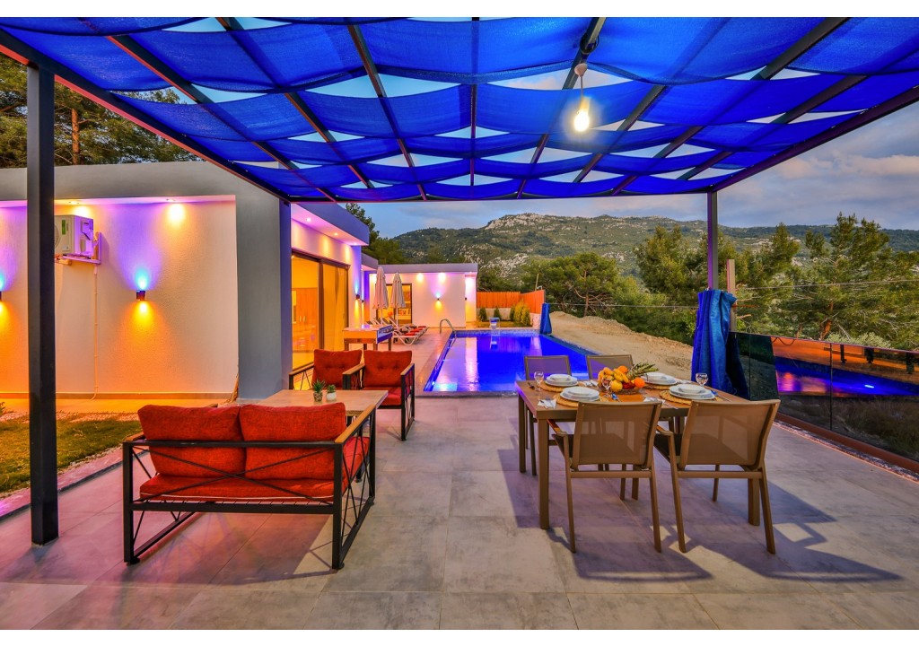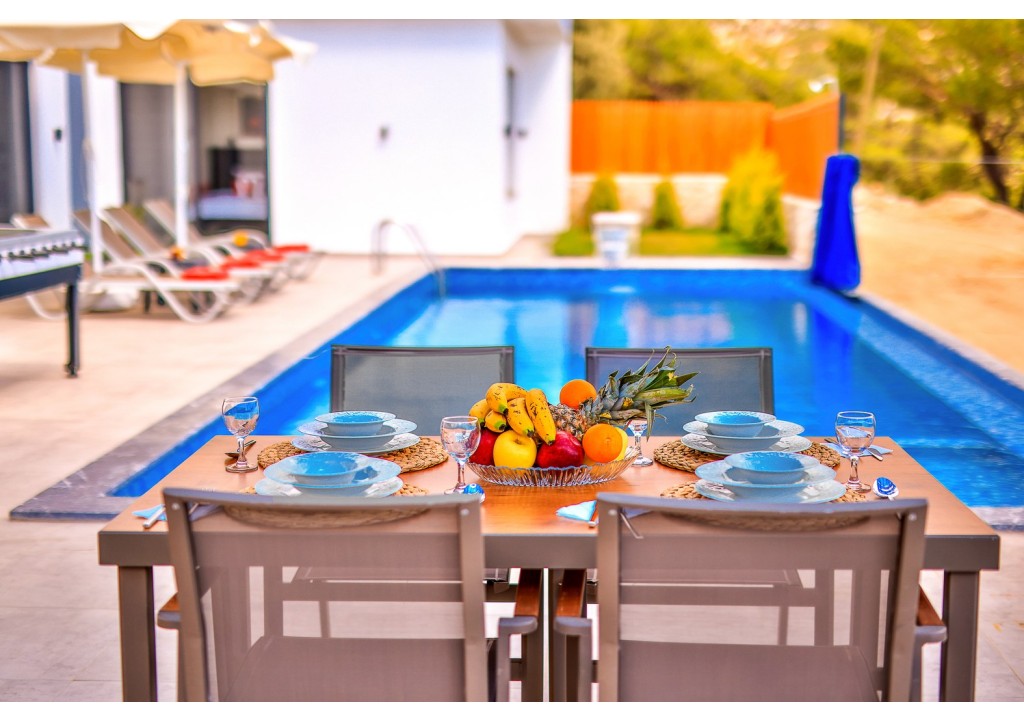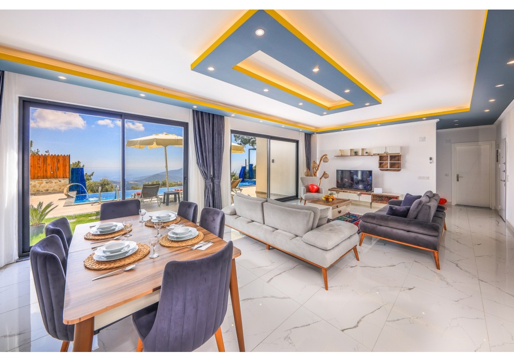 Detayları; Oturma grubu, Uydu TV (LCD), Klima, 6 kişilik yemek masası, Havuz terasına çıkış,