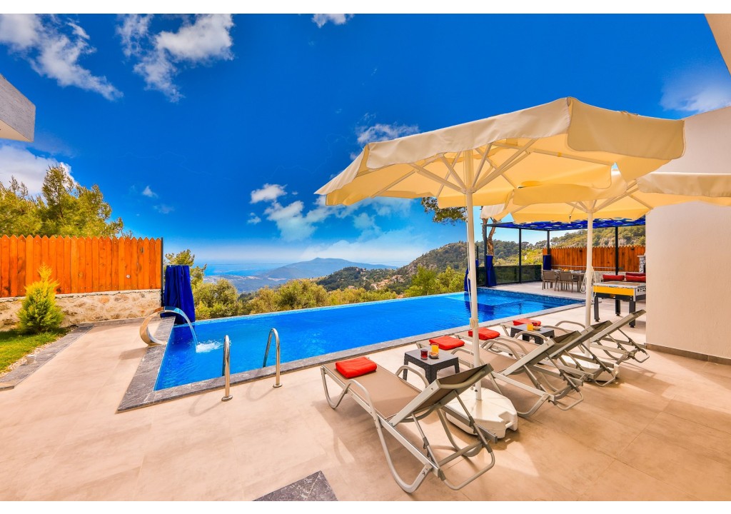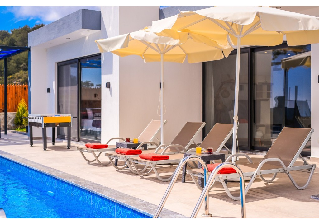 Detayları; Şezlonglar, güneş şemsiyesi, 4 kişilik yemek masası, oturma grubu.