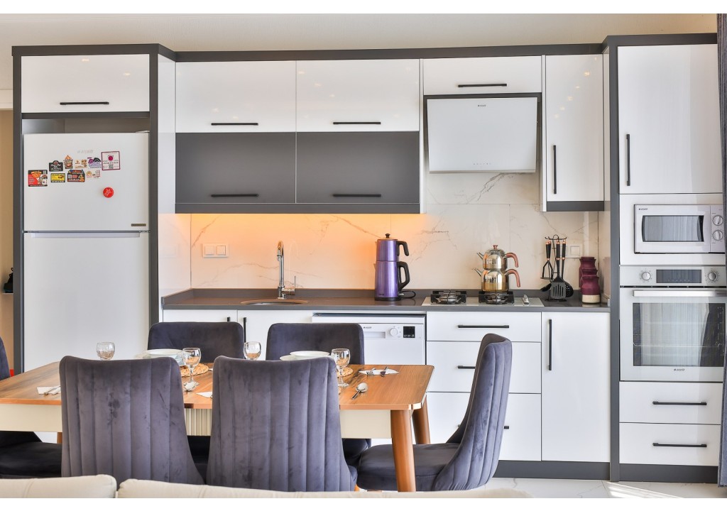 Detayları; Buzdolabı, Bulaşık makinesi, Fırın 4’lü Ocak (ankastre), Mikrodalga fırın, Elektrikli su ısıtıcı, 4 kişilik yemek takımı, Tava, Tencereler, Çatal bıçak vb.
