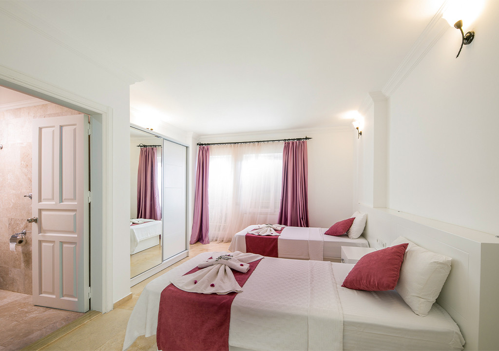 Detayları; İki tane tek kişilik yatak, makyaj masası, komidin, klima, elbise dolabı, banyo ve tuvalet bulunmaktadır.