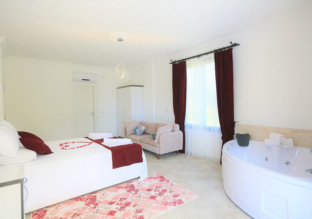 Detayları; Çift kişilik yatak, makyaj masası, komidin, klima, elbise dolabı, jakuzi, banyo ve tuvalet bulunmaktadır.