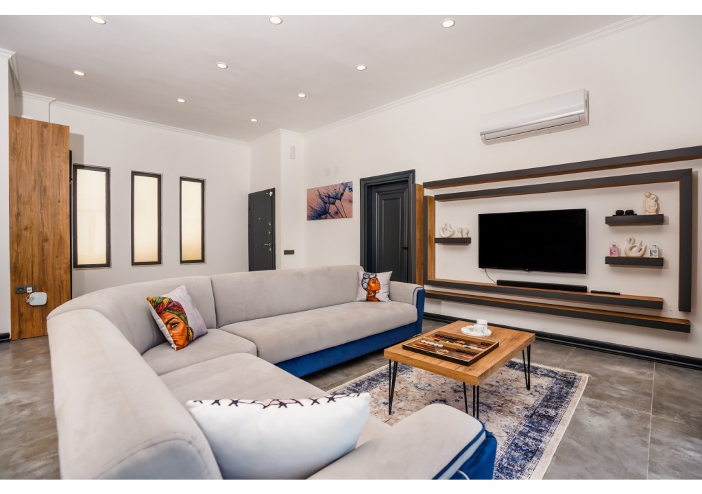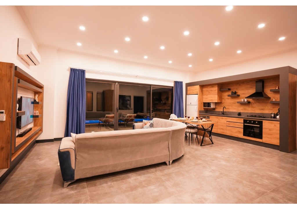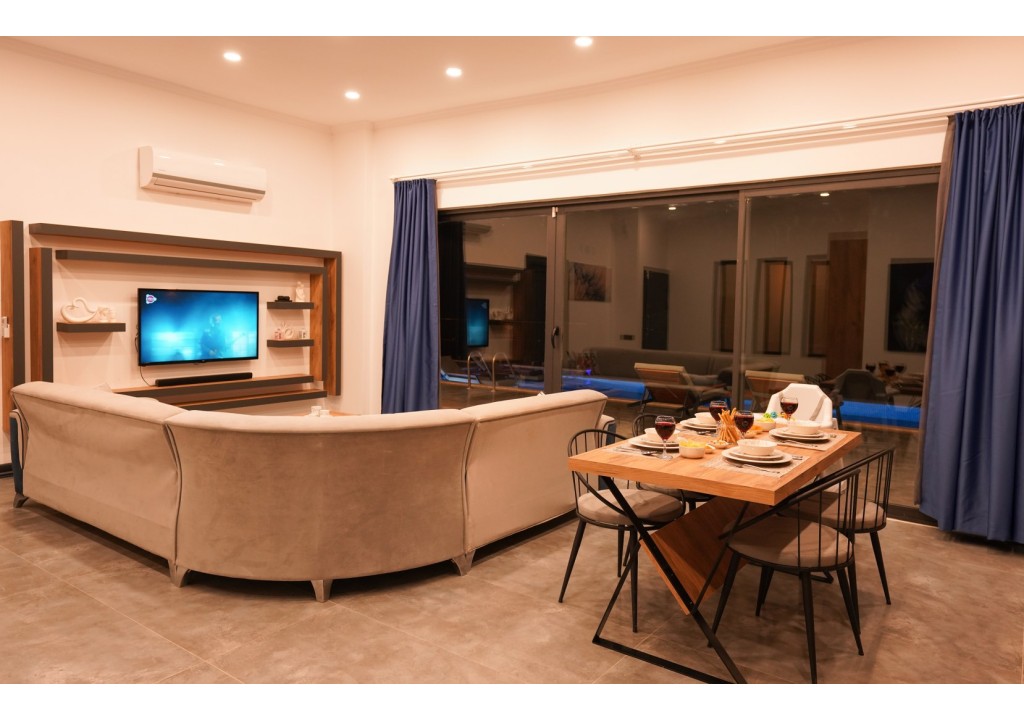 Detayları; Oturma grubu, Uydu TV (LCD), Klima, 4 kişilik yemek masası, Havuz terasına çıkış,