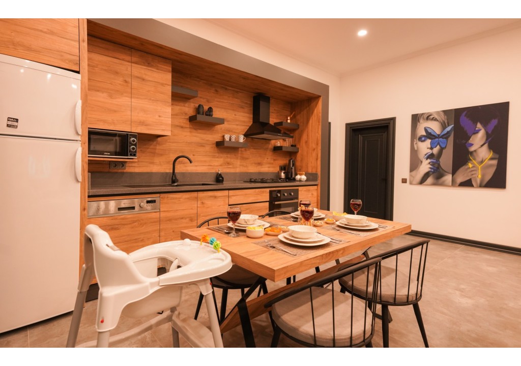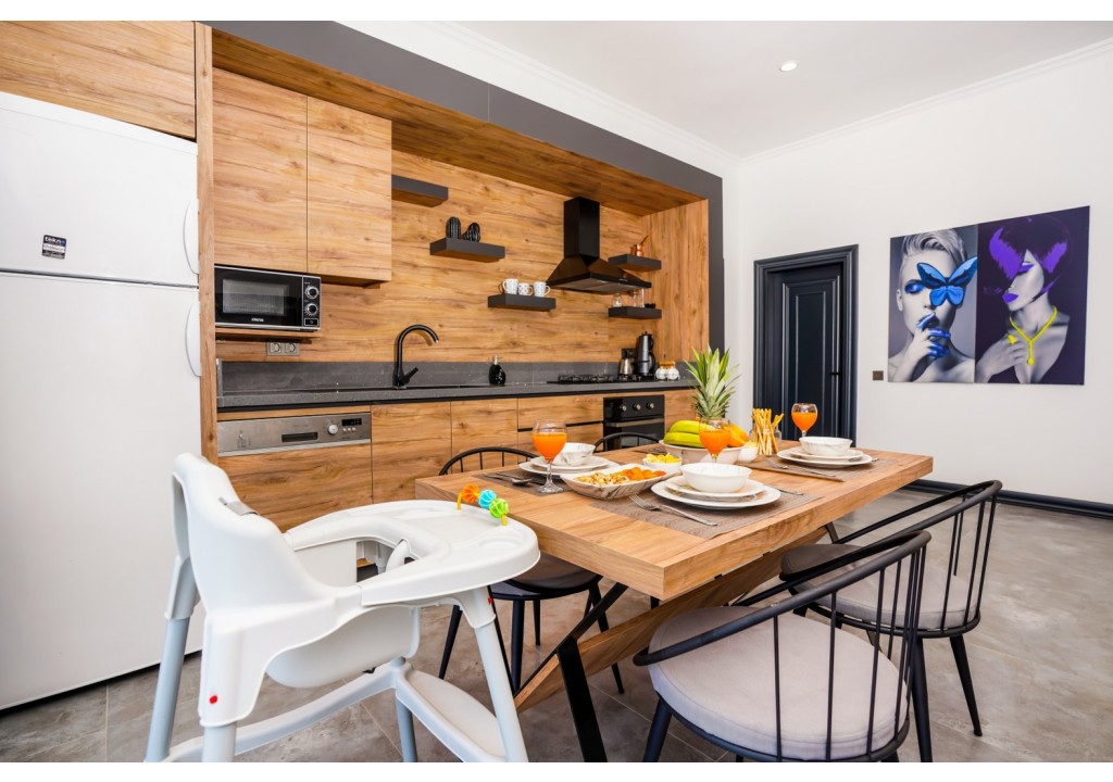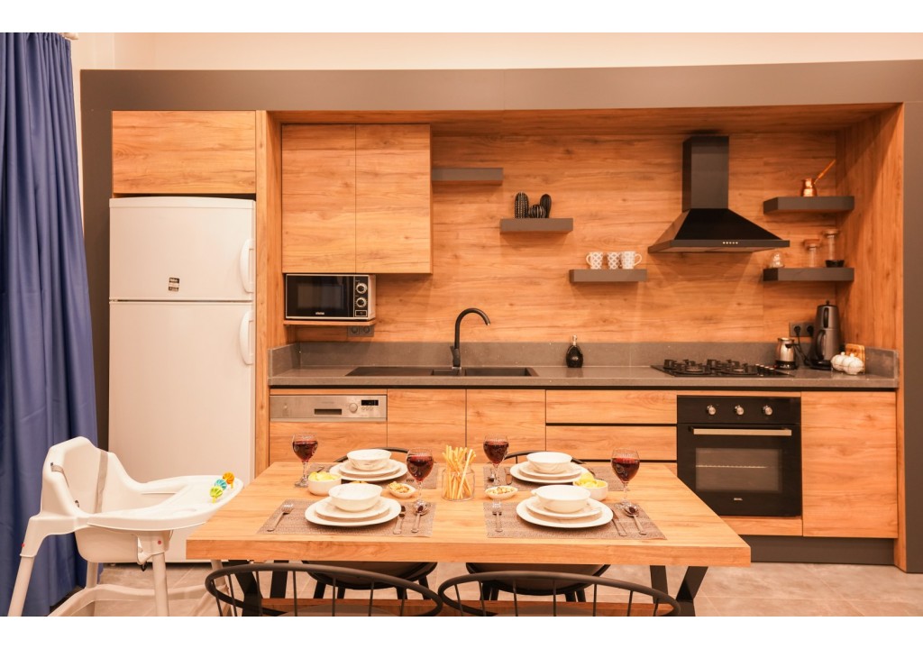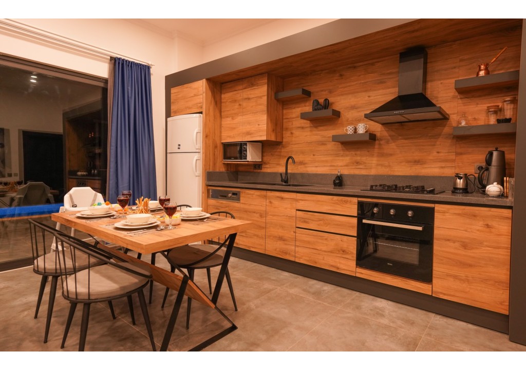 Detayları; Buzdolabı, Bulaşık makinesi, Fırın 4’lü Ocak (ankastre), Mikrodalga fırın, Elektrikli su ısıtıcı, 4 kişilik yemek takımı, Tava, Tencereler, Çatal bıçak vb.