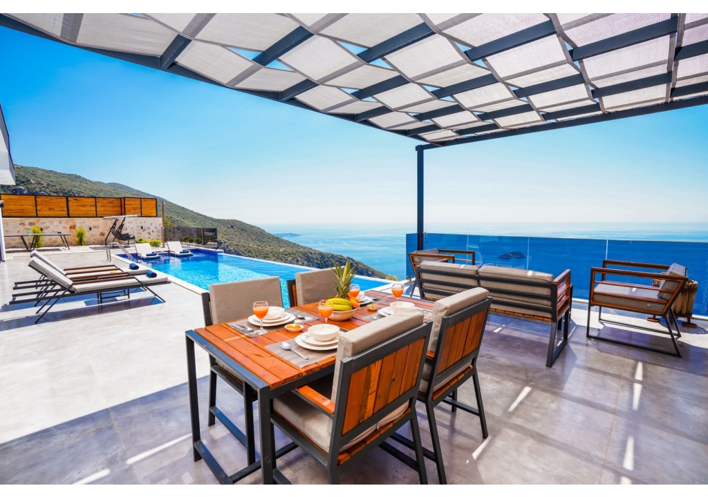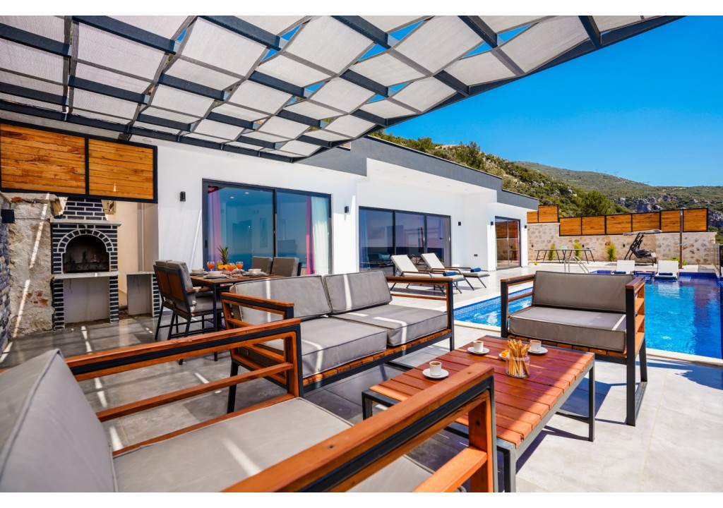Detayları; Şezlonglar, güneş şemsiyesi, 4 kişilik yemek masası, oturma grubu.