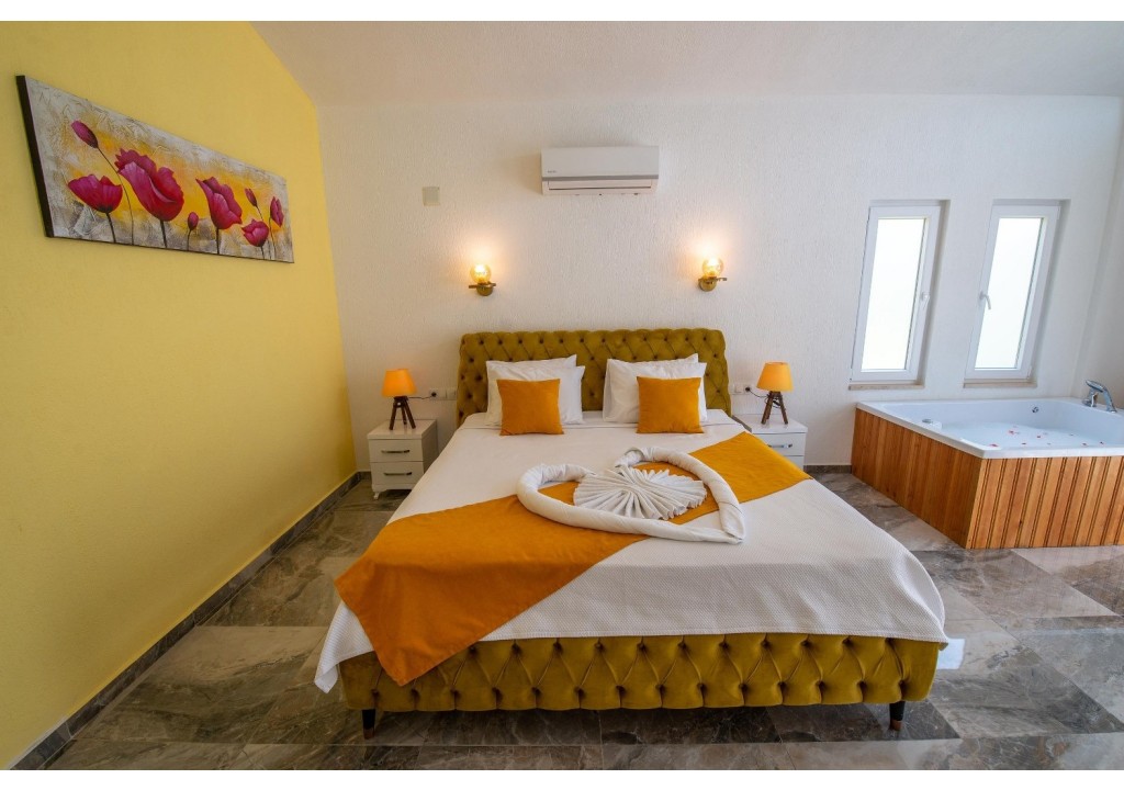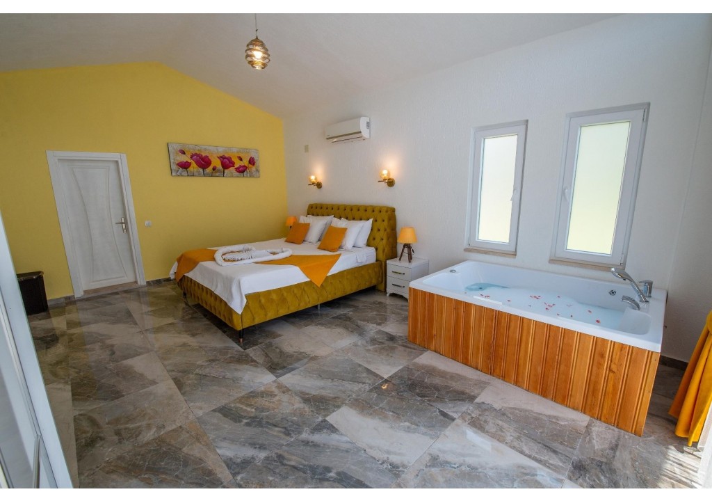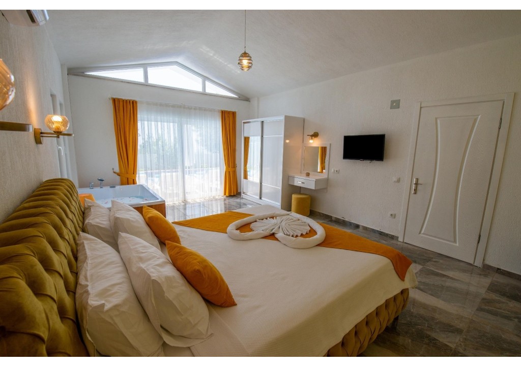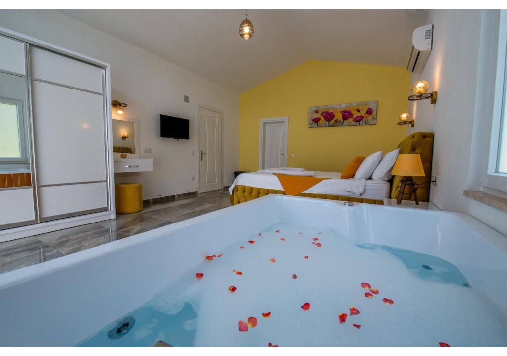 Detayları; Çift kişilik yatak, makyaj masası, komidin, klima, elbise dolabı, jakuzi, banyo ve tuvalet bulunmaktadır.