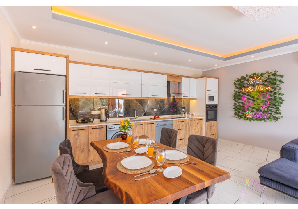Detayları; Buz dolabı, Bulaşık makinesi, Fırın 4’lü Ocak (ankastre), Mikrodalga fırın, Elektrikli su ısıtıcı, 4 kişilik yemek takımı, Tava, Tencereler, Çatal bıçak vb.