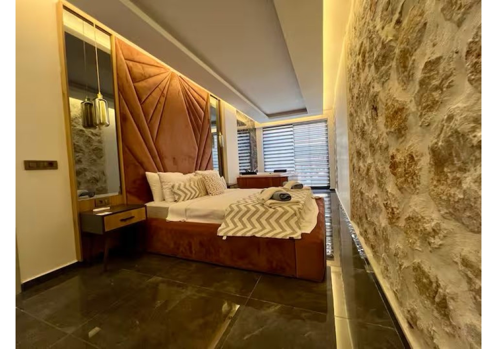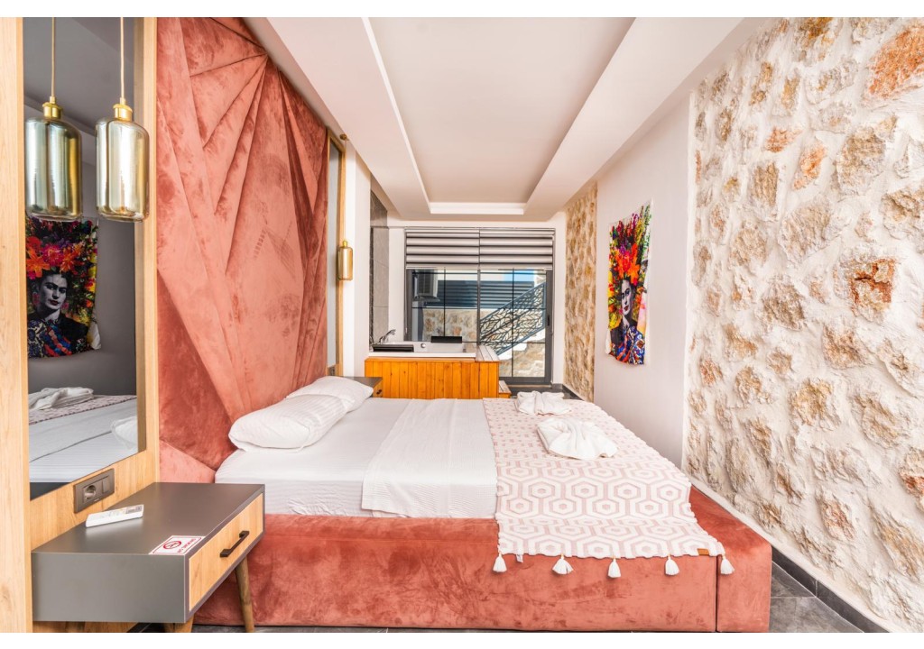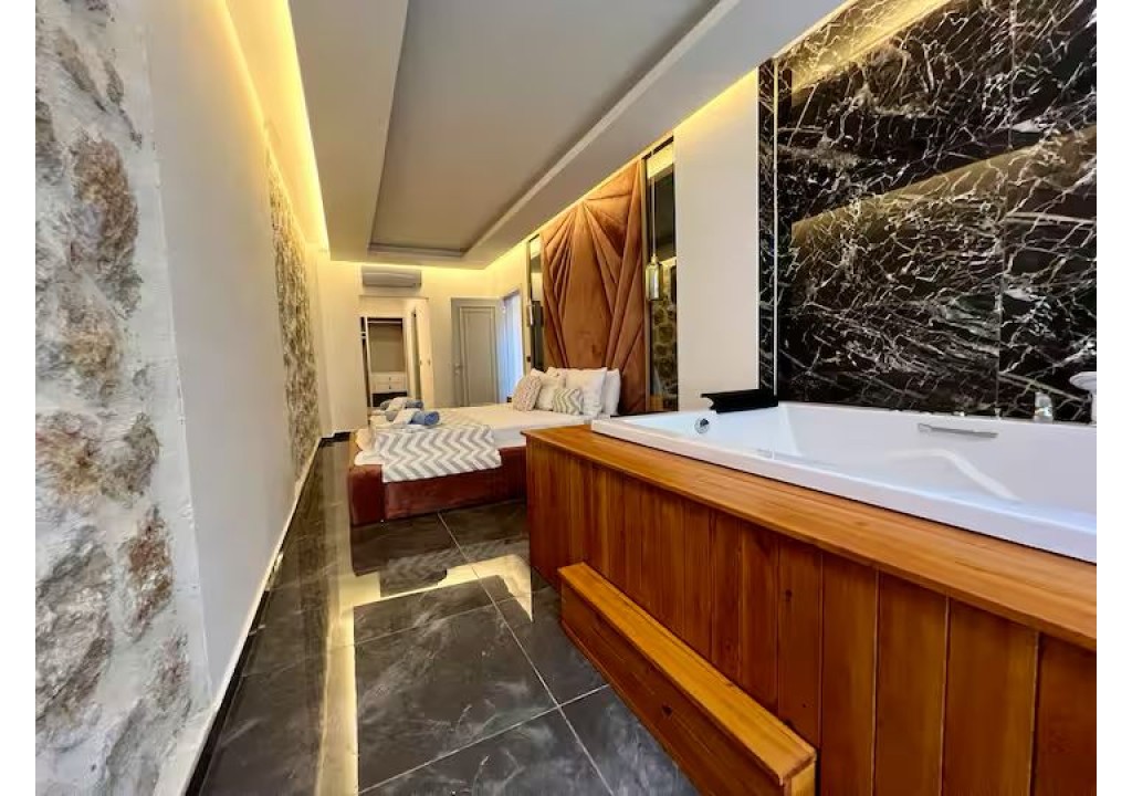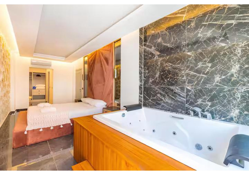 Detayları; Çift kişilik yatak, makyaj masası, komodin, klima, elbise dolabı, jakuzi banyo ve tuvalet yer almaktadır.