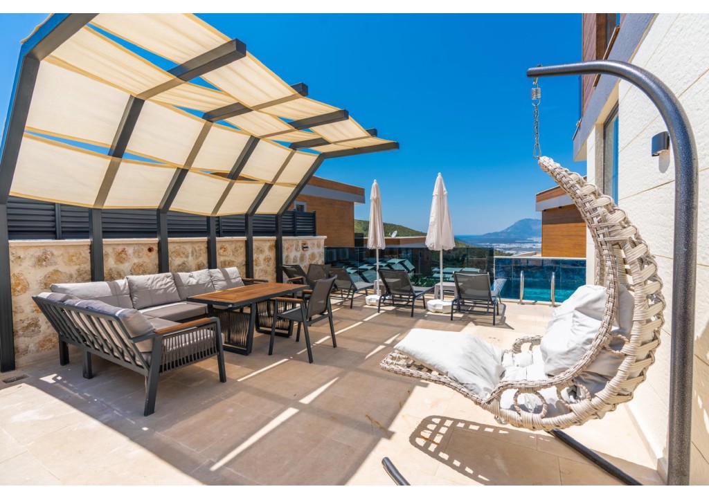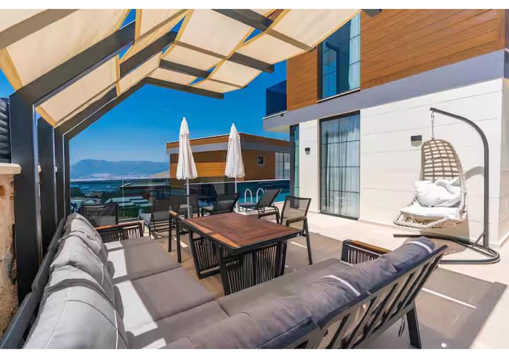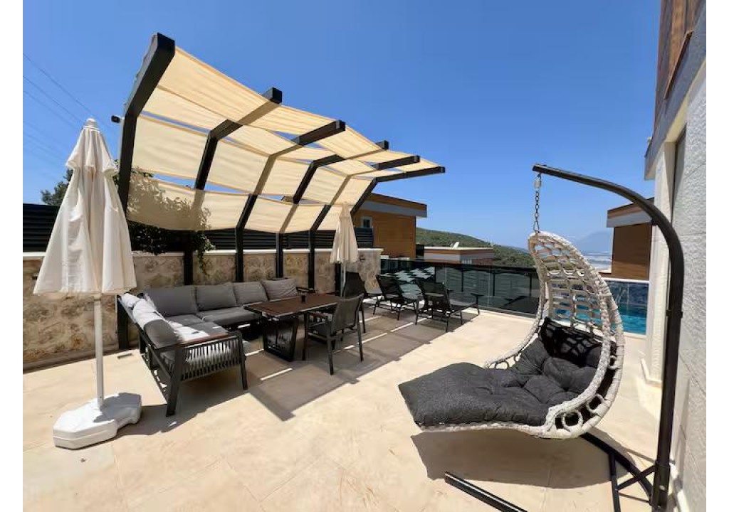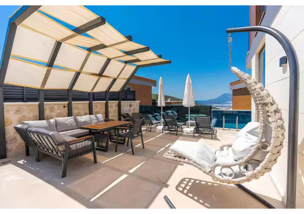 Detayları; Şezlonglar, güneş şemsiyeleri, yemek masası ve oturma grubu bulunmaktadır.