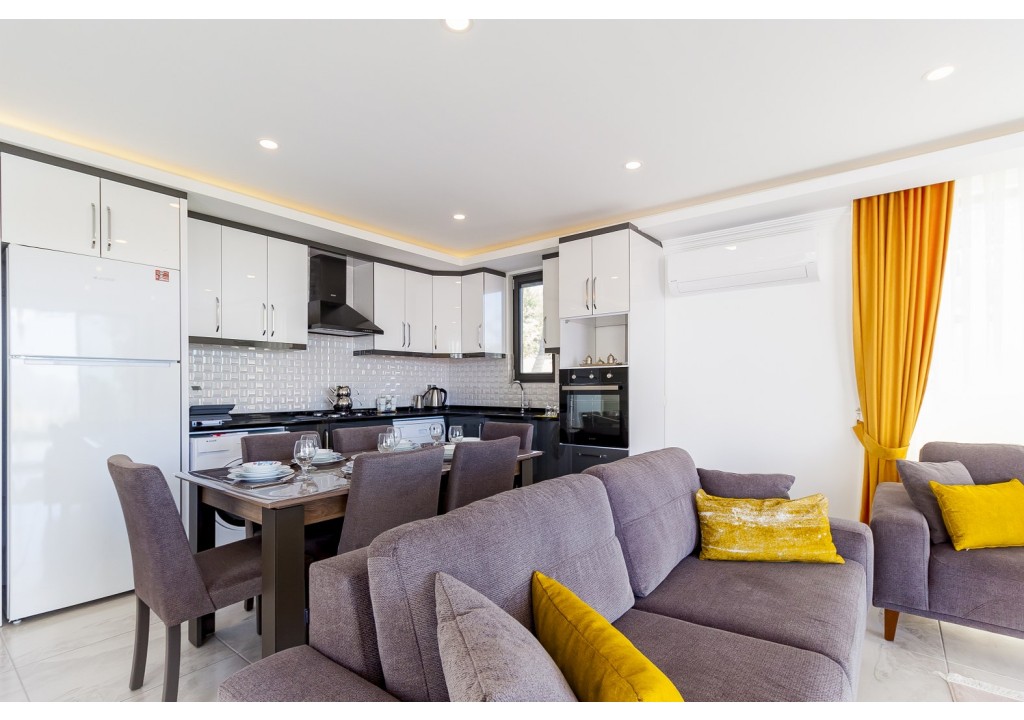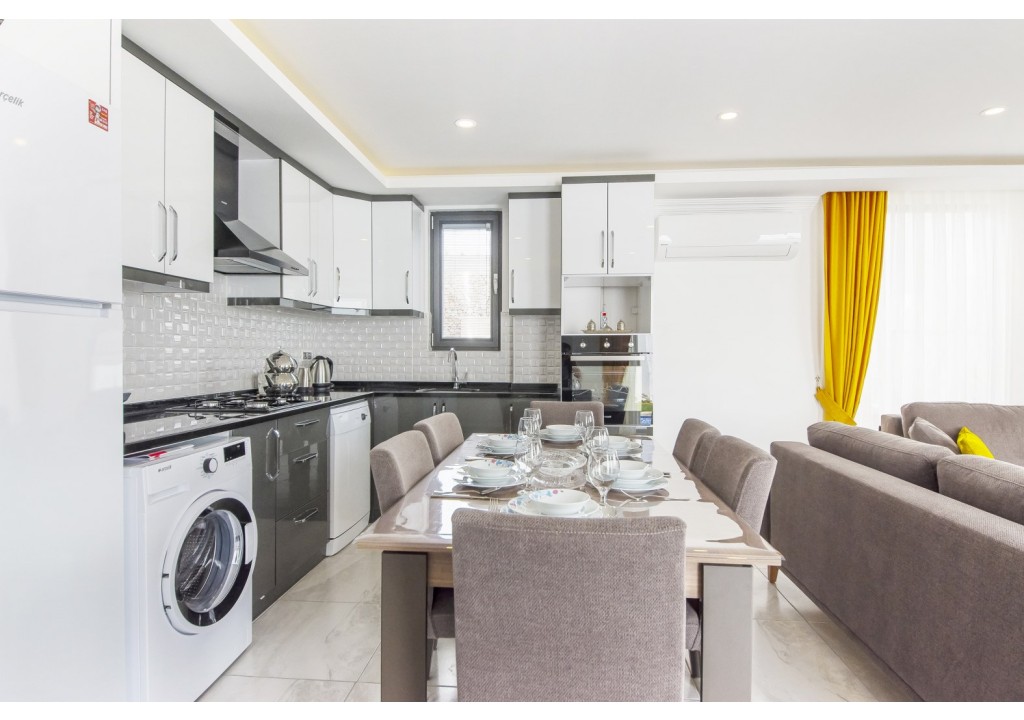 Detayları; Amerikan tarzı mutfak içerisinde buzdolabı, bulaşık makinesi, çamaşır makinesi, fırın, kahve makinesi, 4’lü ocak (ankastre), mikrodalga fırın, elektrikli su ısıtıcı, tava & tencere vb. mutfak ekipmanları ve 6 kişilik yemek takımı bulunmaktadır.