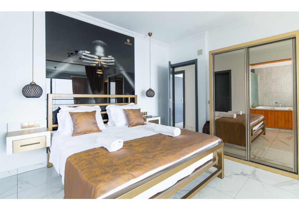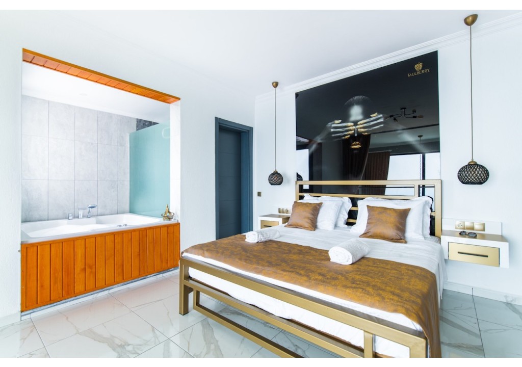Detayları; Çift kişilik yatak, makyaj masası, komidin, klima, elbise dolabı, jakuzi, banyo ve tuvalet bulunmaktadır.