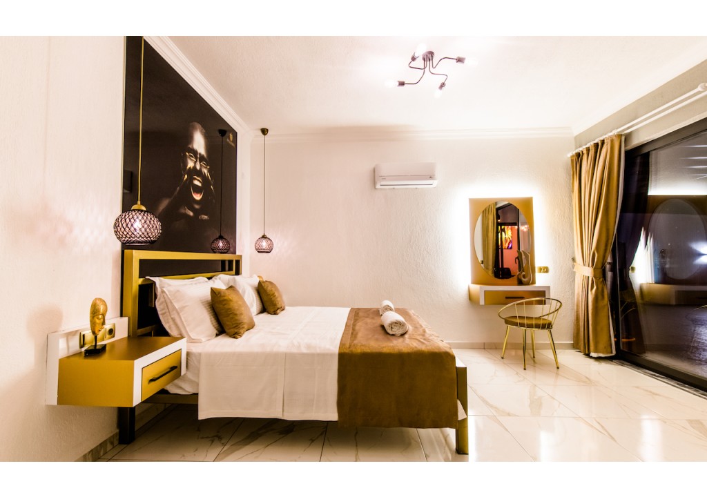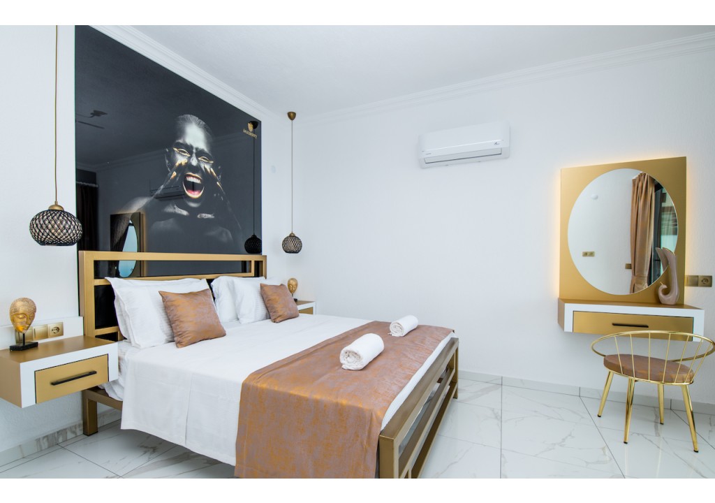 Detayları; Çift kişilik yatak, makyaj masası, komidin, klima, elbise dolabı, banyo ve tuvalet bulunmaktadır.