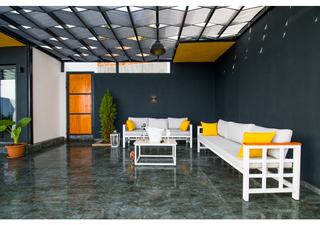 Detayları; Oturma grubu, şezlonglar, güneşlikler,6 kişilik yemek masası, oturma grubu.