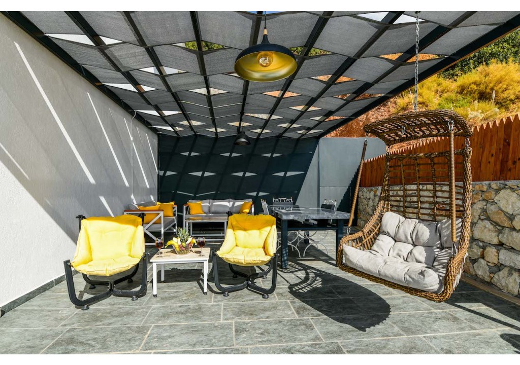 Detayları; Oturma grubu, şezlonglar, güneşlikler, 3 kişilik yemek masası, oturma grubu.
