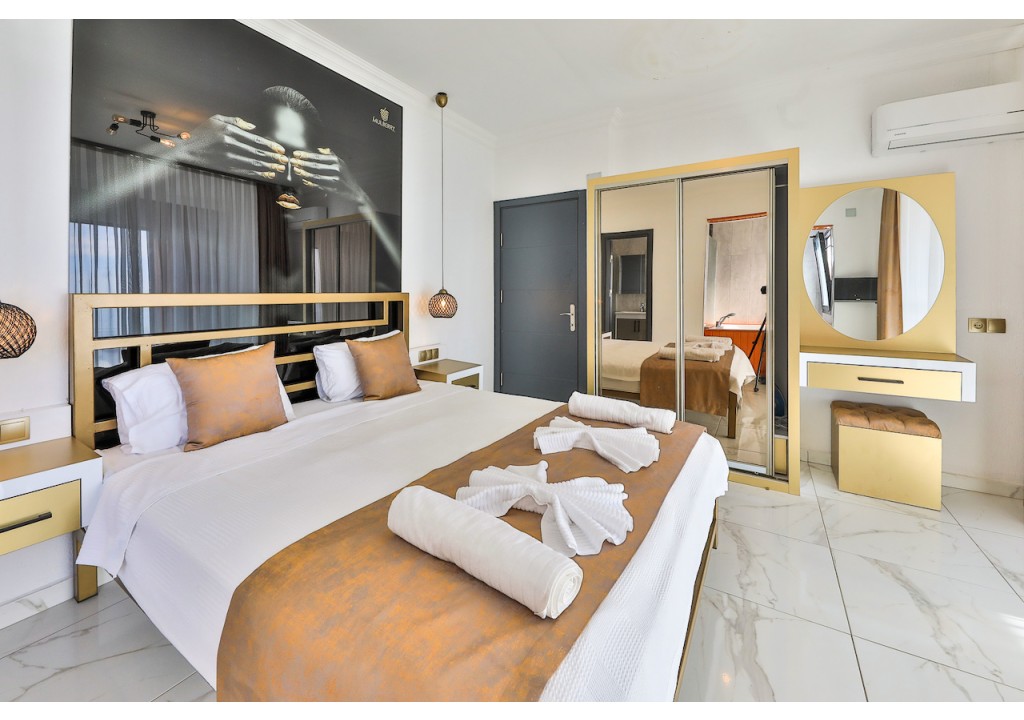 Detayları; Çift kişilik yatak, makyaj masası, komidin, klima, elbise dolabı, banyo ve tuvalet bulunmaktadır.