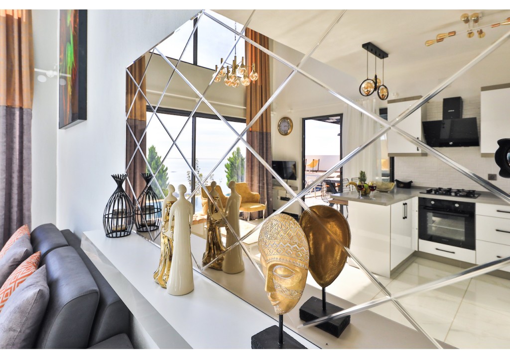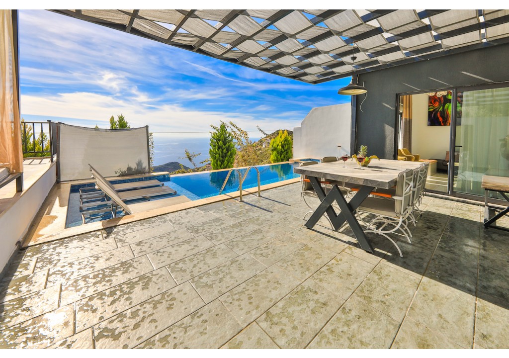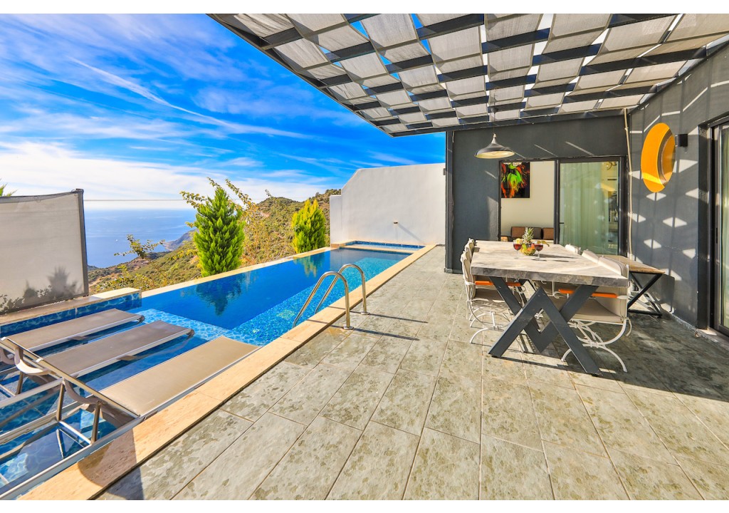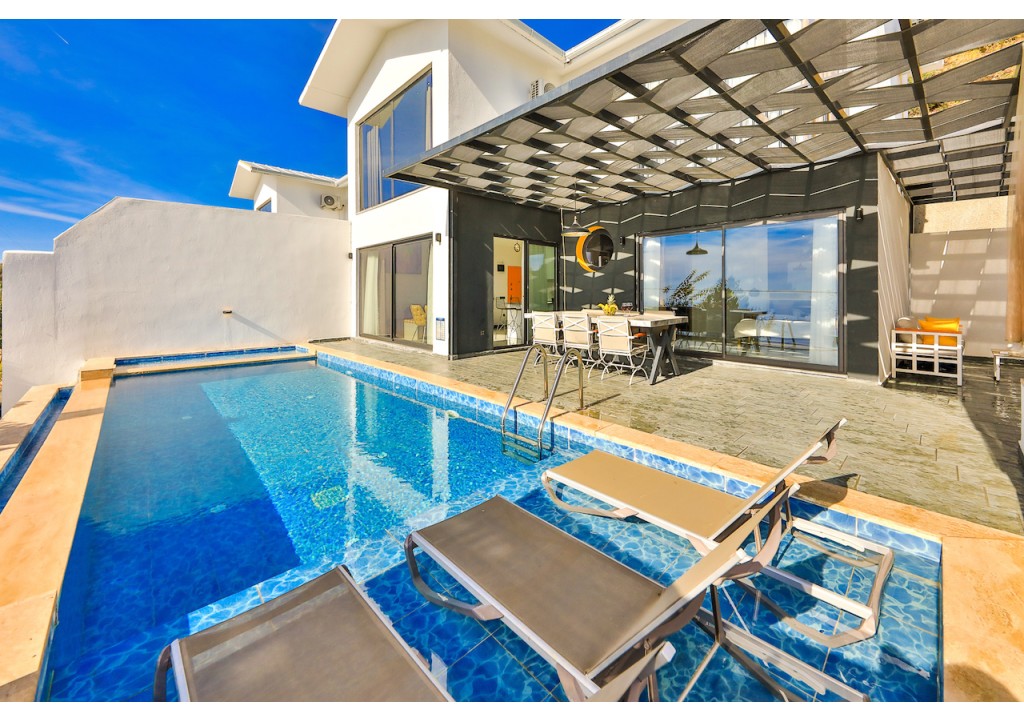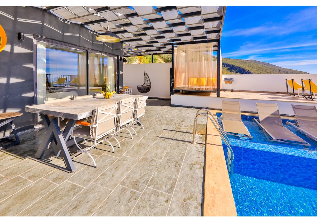 Detayları; Oturma grubu, Uydu TV (LCD), Klima, 6 kişilik yemek masası, Havuz terasına çıkış,