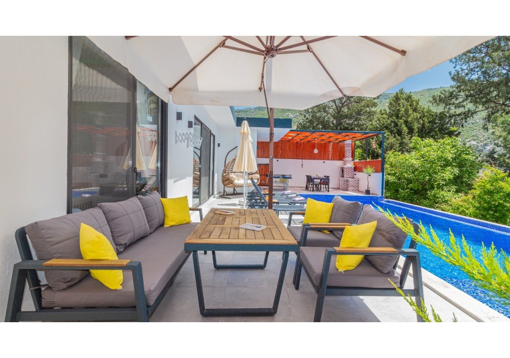 Detayları; Şezlonglar, güneş şemsiyesi, 6 kişilik yemek masası, oturma grubu.