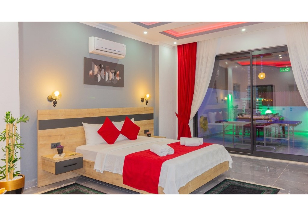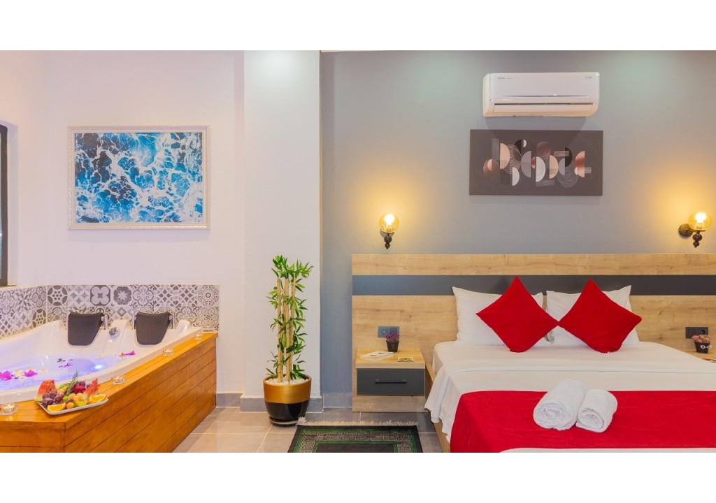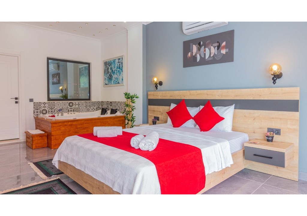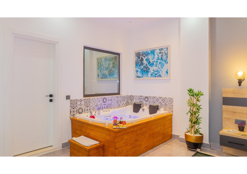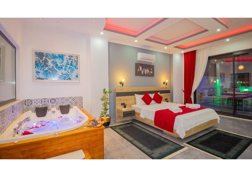 Detayları; Çift kişilik yatak, makyaj masası, komidin, klima, elbise dolabı, jakuzi, banyo ve tuvalet bulunmaktadır.