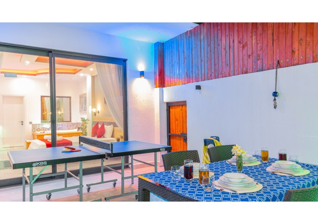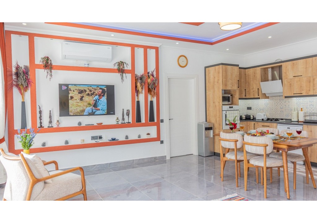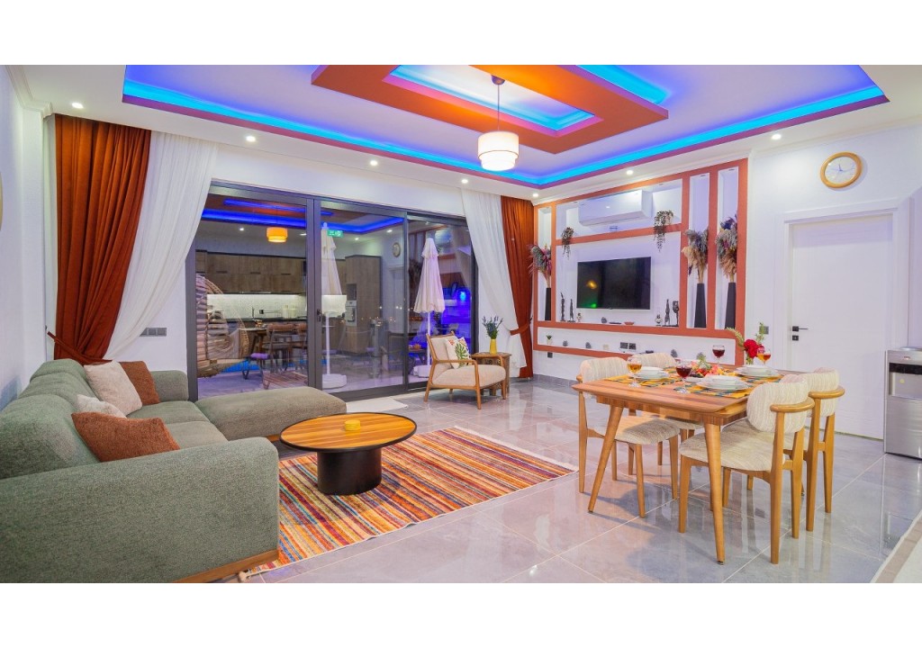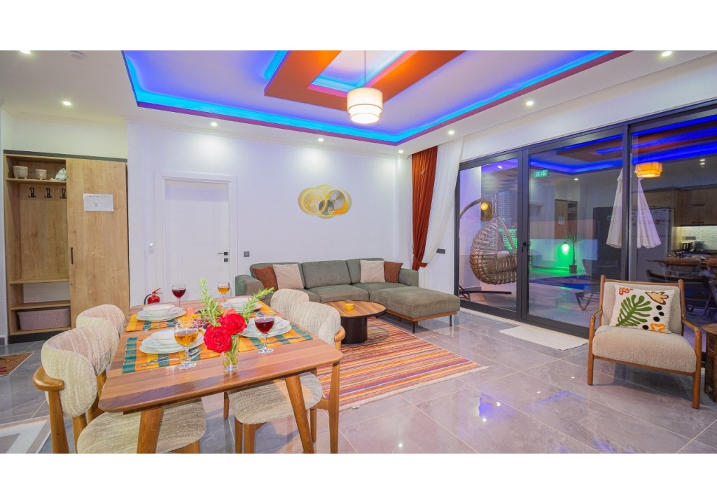 Detayları; Oturma grubu, Uydu TV (LCD), Klima, 6 kişilik yemek masası, Havuz terasına çıkış,