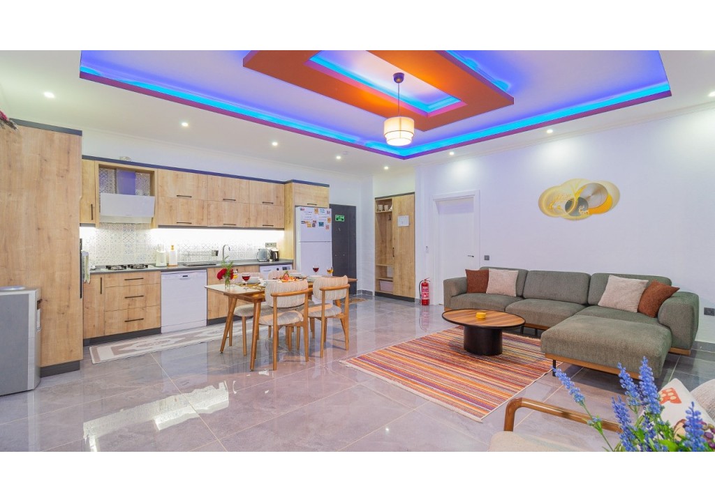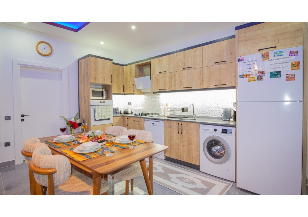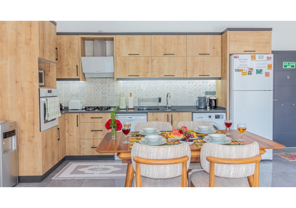 Detayları; Buzdolabı, Bulaşık makinesi, Fırın 4’lü Ocak (ankastre), Mikrodalga fırın, Elektrikli su ısıtıcı, 4 kişilik yemek takımı, Tava, Tencereler, Çatal bıçak vb.