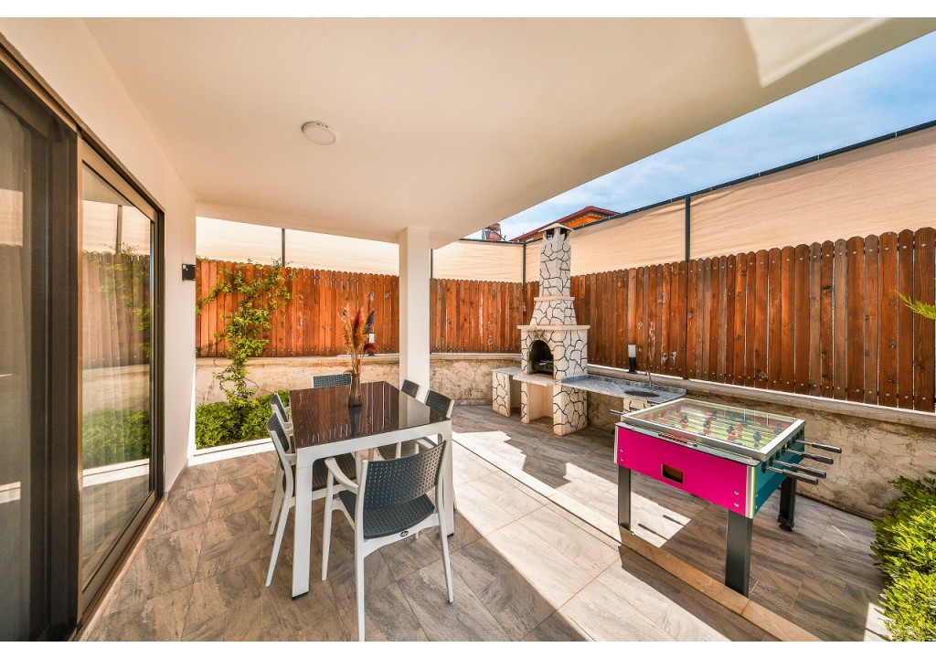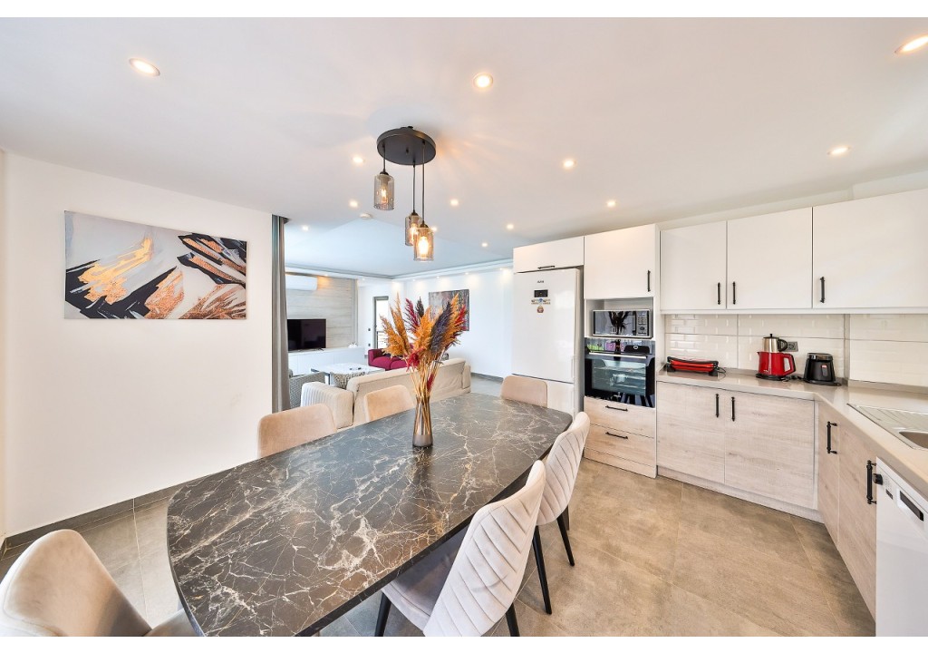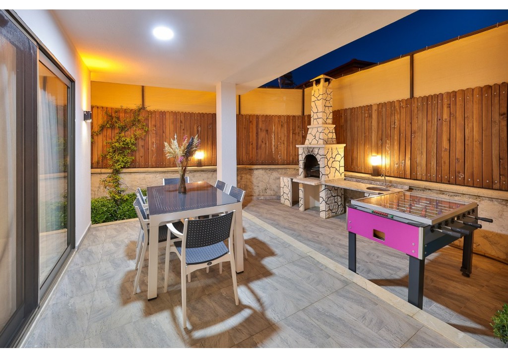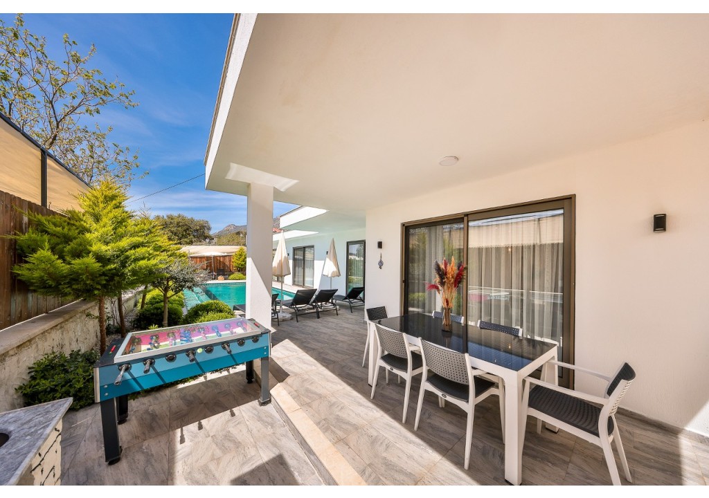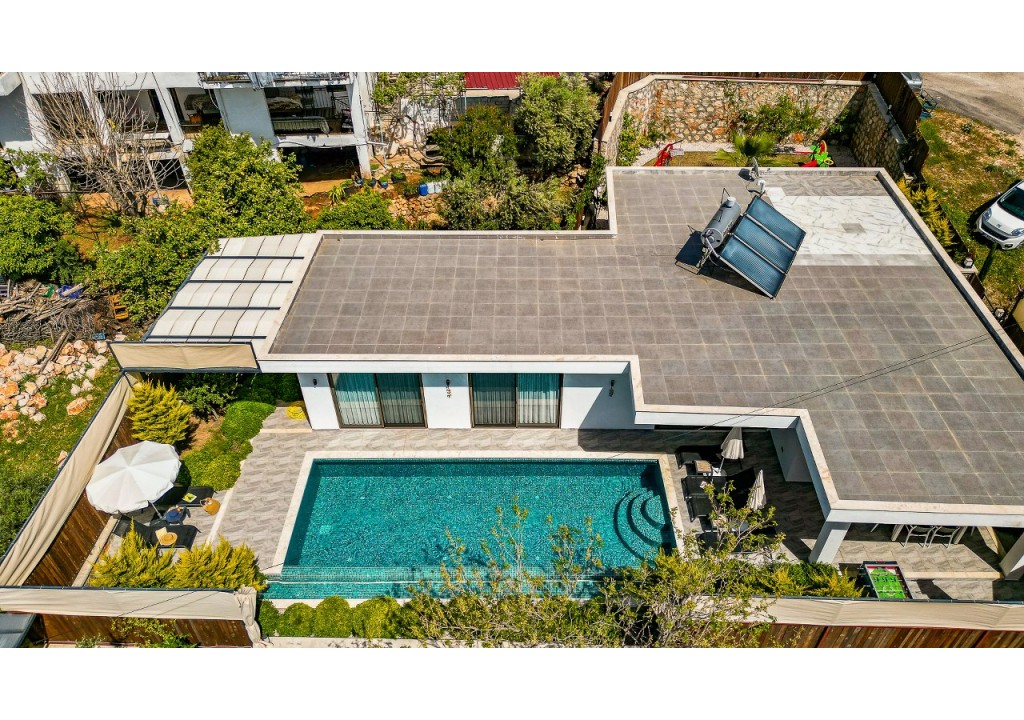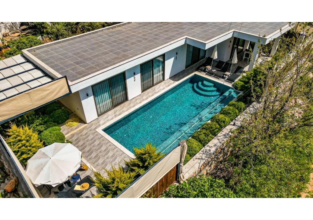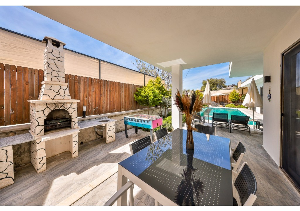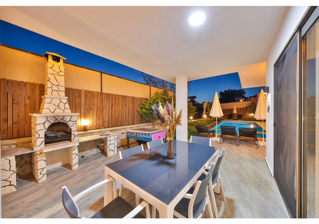 Detayları; Oturma grubu, Uydu TV (LCD), Klima, 6 kişilik yemek masası, Havuz terasına çıkış,
