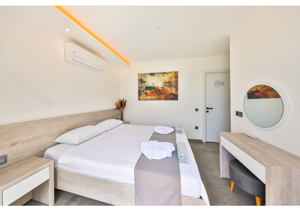 Detayları; Çift kişilik yatak, komodin, klima, elbise dolabı, banyo ve tuvalet bulunmaktadır.