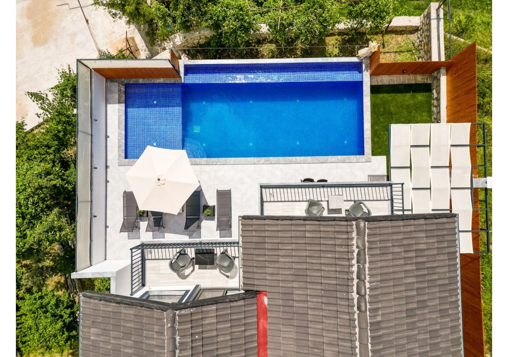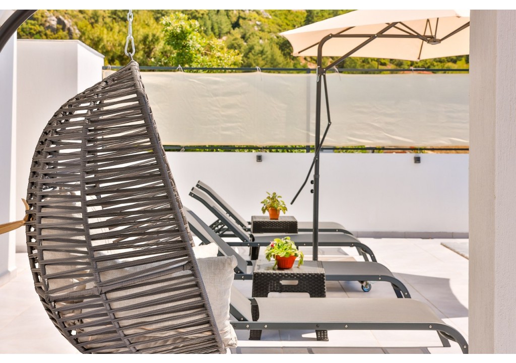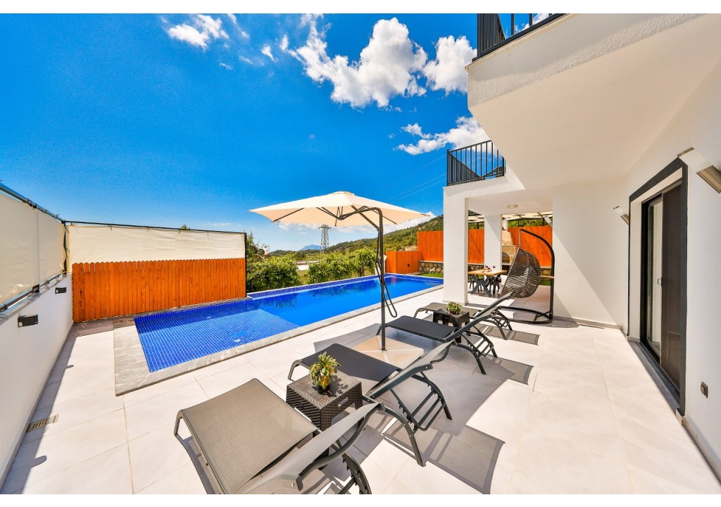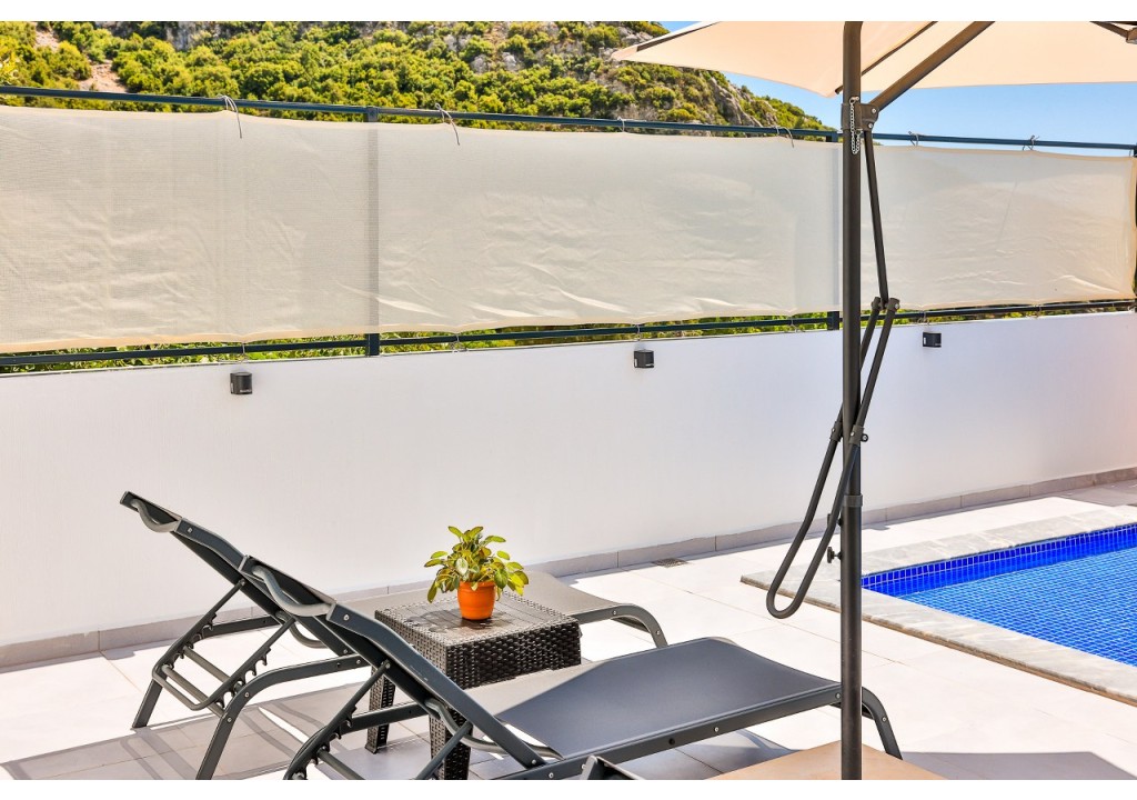 Detayları; Şezlonglar, güneş şemsiyesi, 4 kişilik yemek masası, oturma grubu.