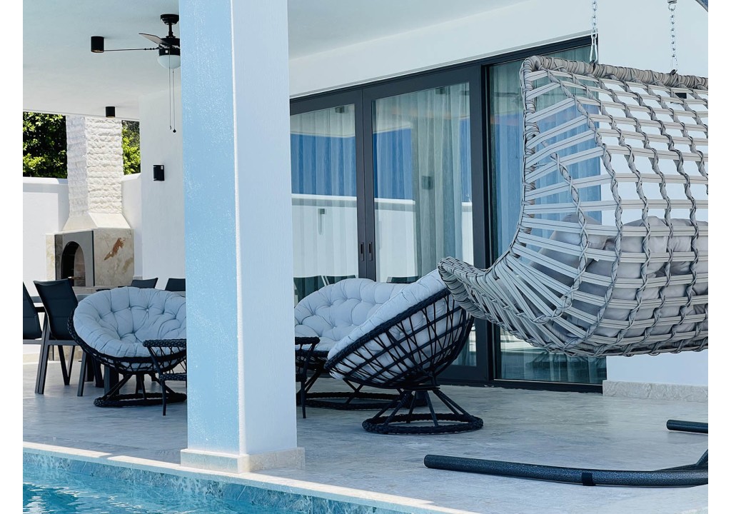 Detayları; Şezlonglar, güneş şemsiyesi, 4 kişilik yemek masası, oturma grubu.