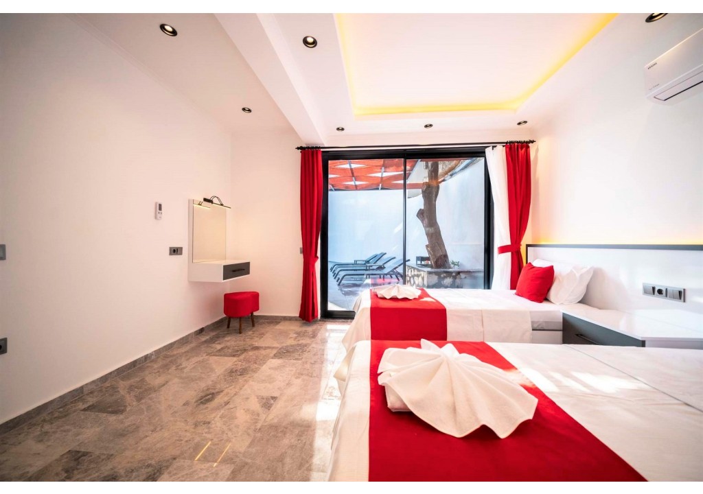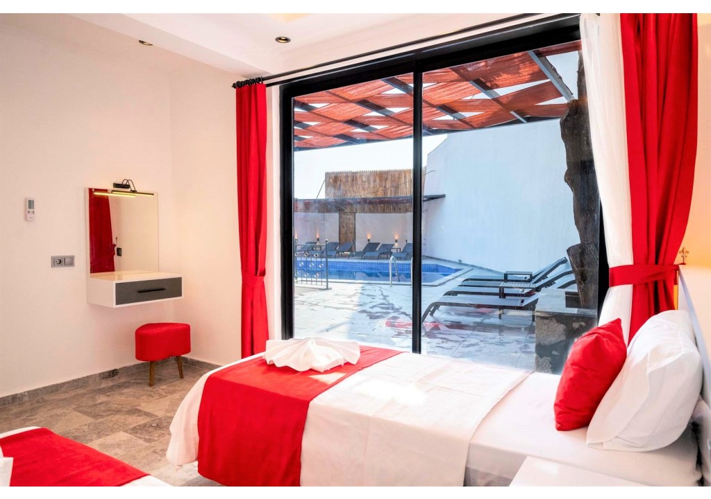 Detayları; Oturma grubu, uydu TV, klima, yemek masası ve havuz terasına çıkış bulunmaktadır.