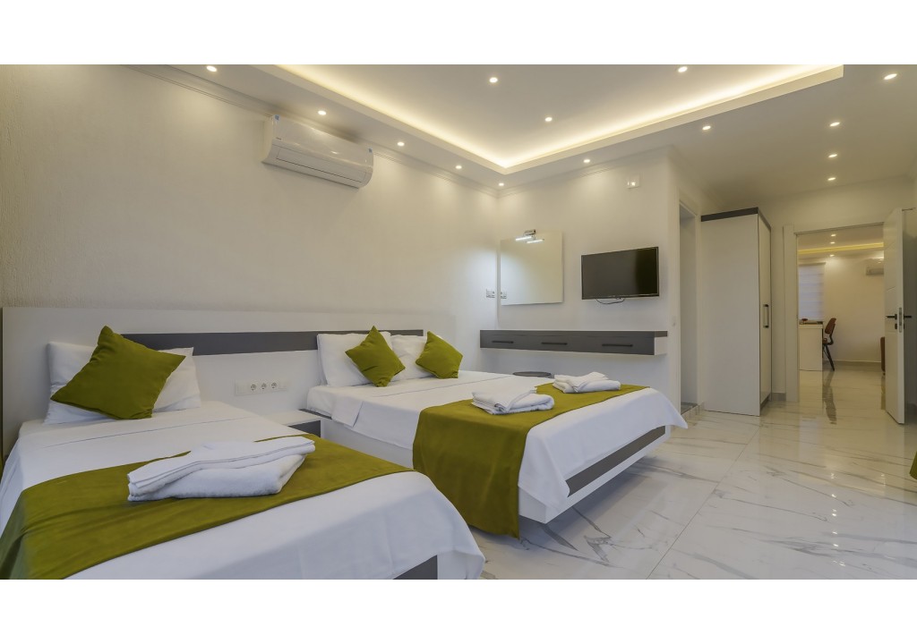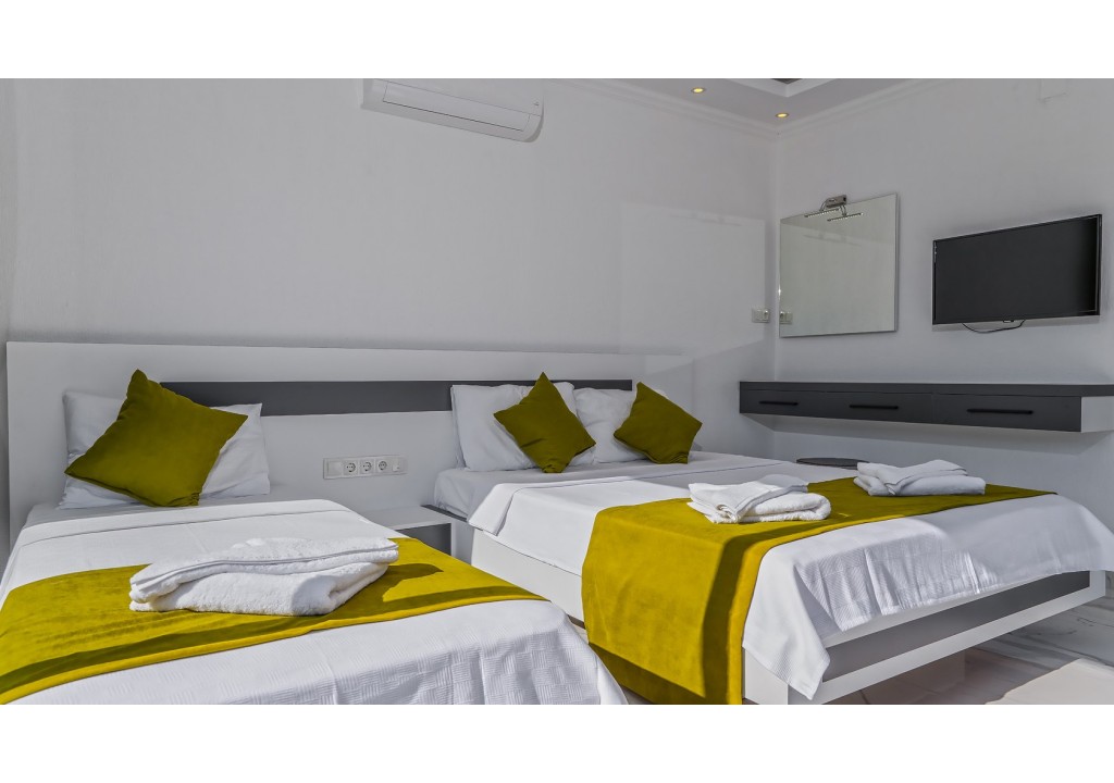 Detayları; Bir adet çift kişilik yatak, iki adet tek kişilik yatak, makyaj masası, komidin, klima, elbise dolabı, banyo ve tuvalet bulunmaktadır.