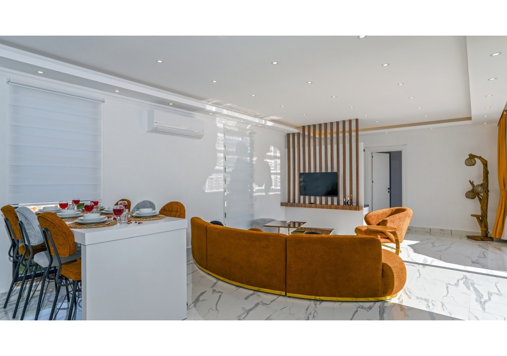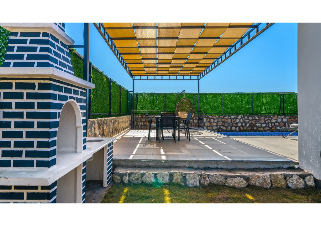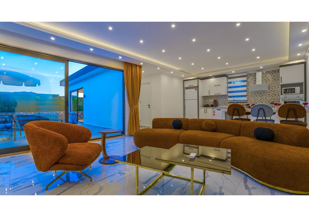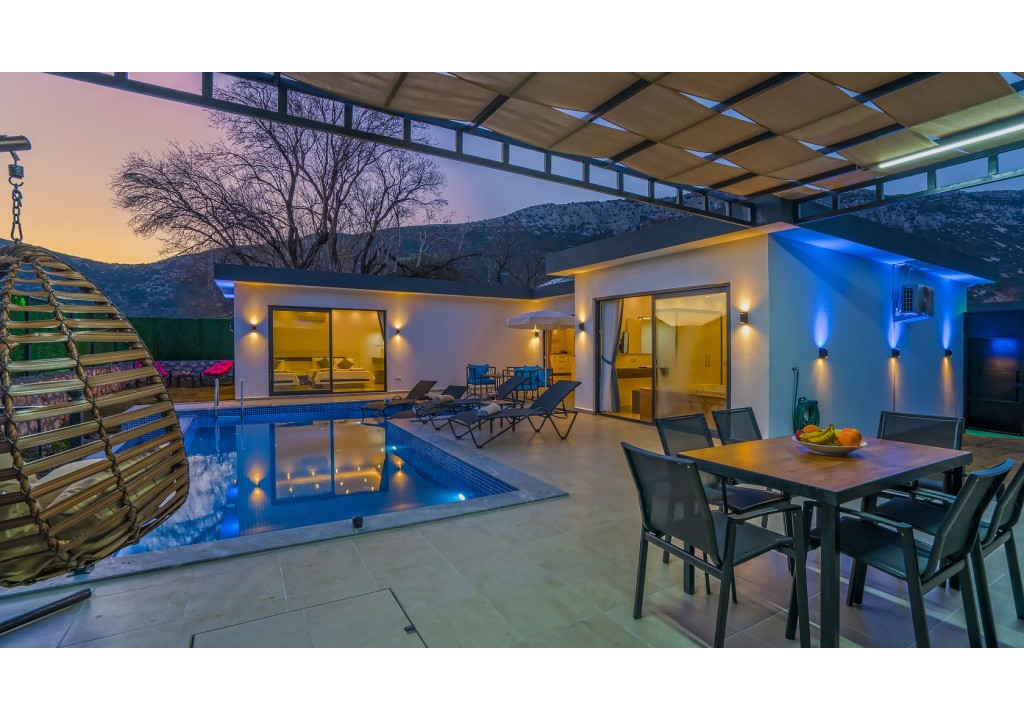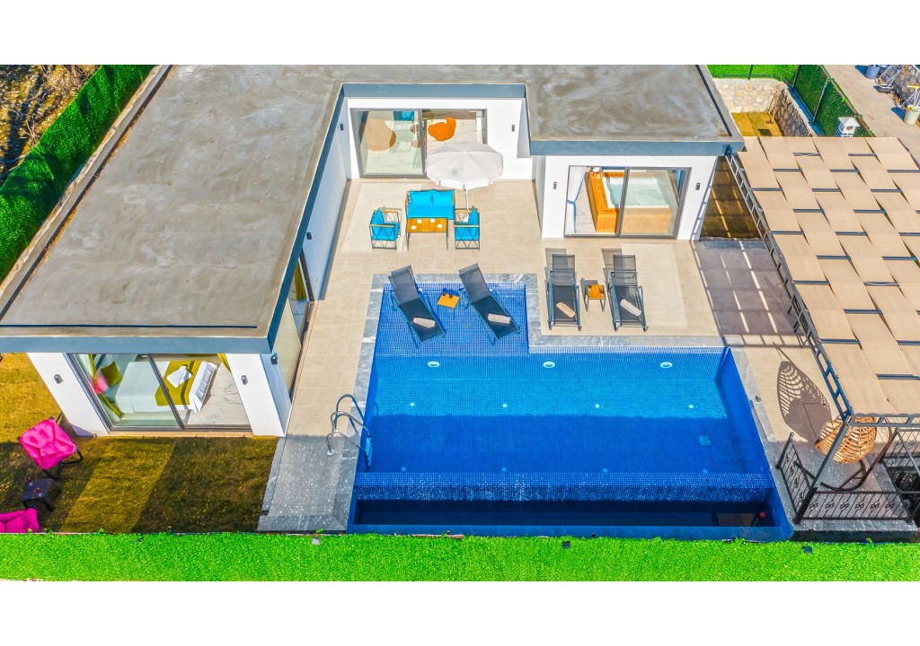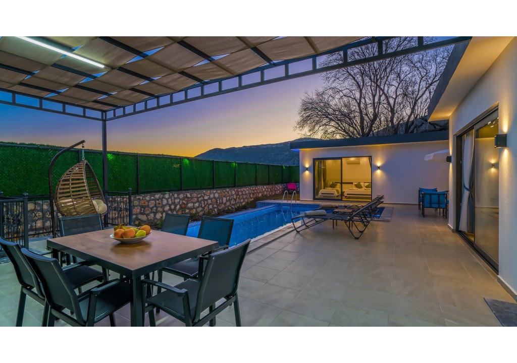 Detayları; Oturma grubu, Uydu TV (LCD), Klima, 4 kişilik yemek masası, Havuz terasına çıkış,