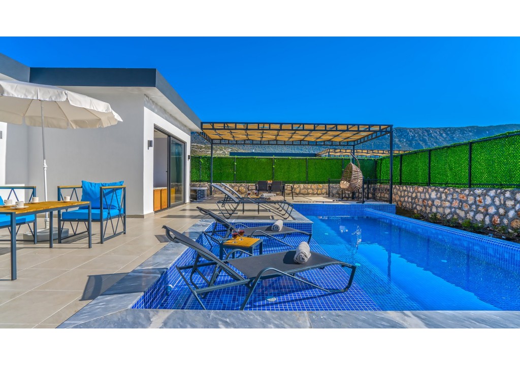 Detayları; Şezlonglar, güneş şemsiyesi, 4 kişilik yemek masası, oturma grubu.