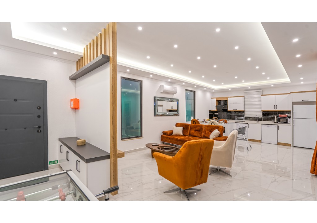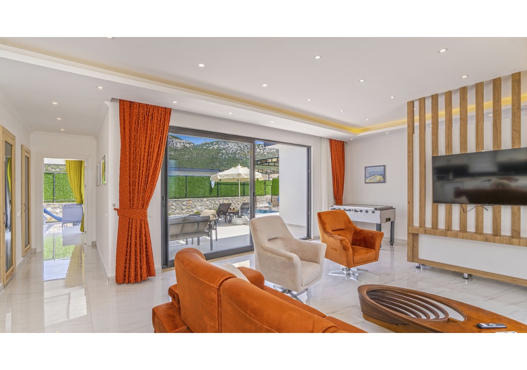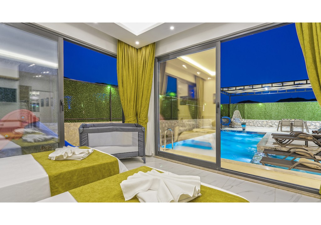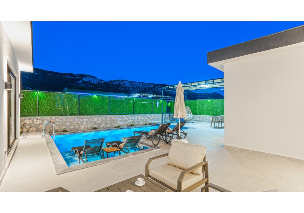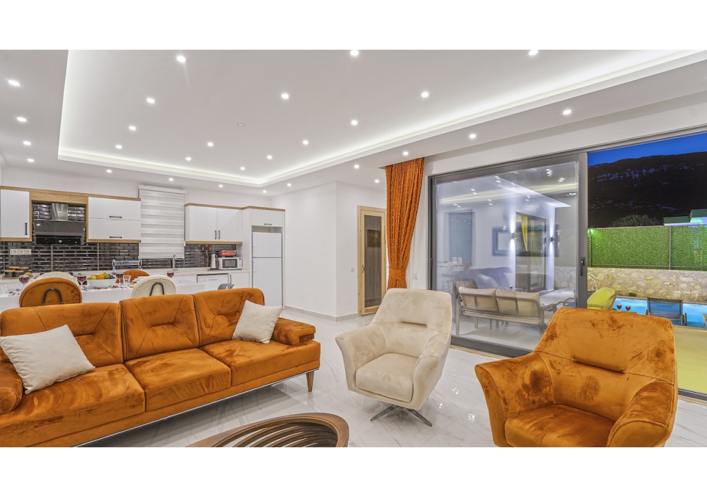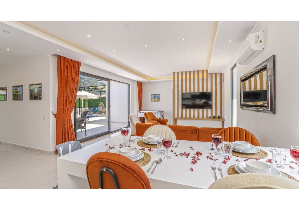 Detayları; Oturma grubu, Uydu TV (LCD), Klima, 4 kişilik yemek masası, Havuz terasına çıkış