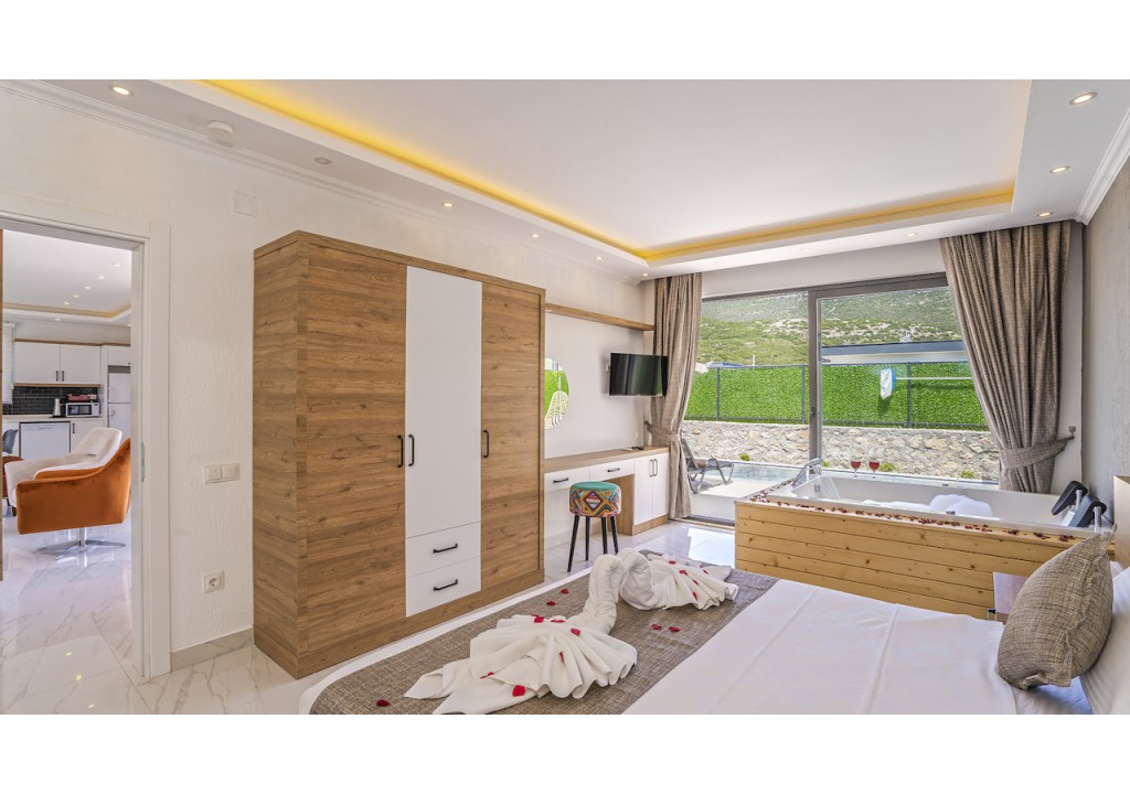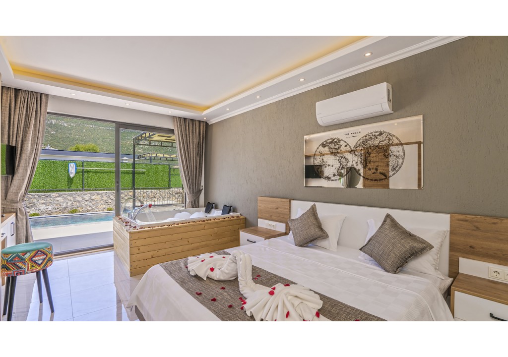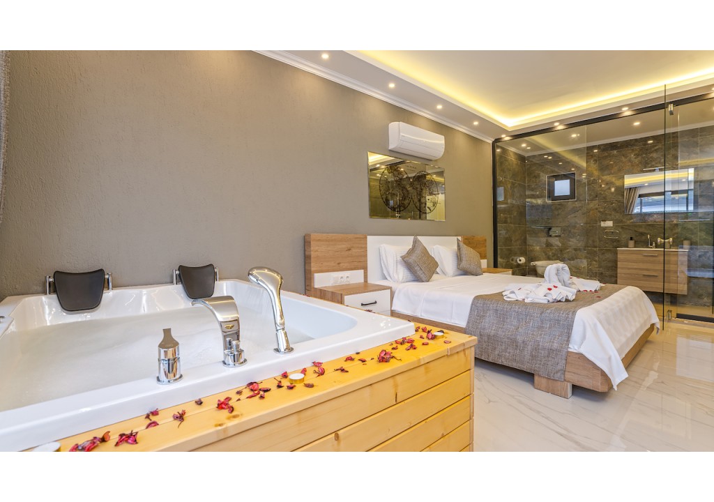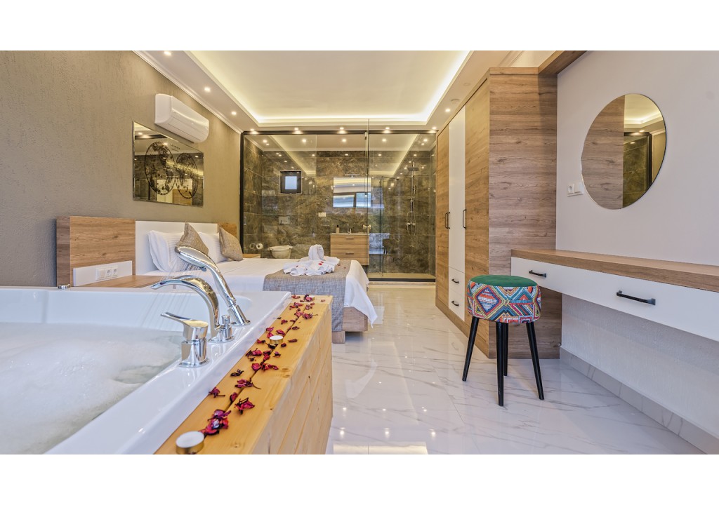 Detayları; Çift kişilik yatak, makyaj masası, komidin, klima, elbise dolabı, jakuzi, banyo ve tuvalet bulunmaktadır.