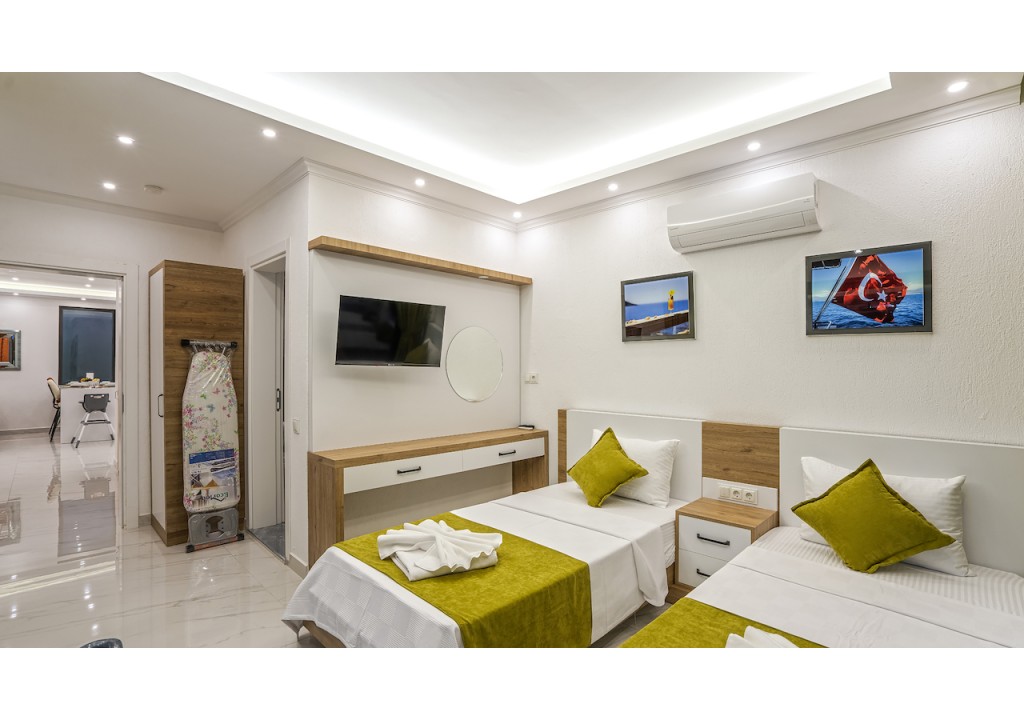 Detayları; İki adet tek kişilik yatak, makyaj masası, komidin, klima, elbise dolabı, banyo ve tuvalet bulunmaktadır.