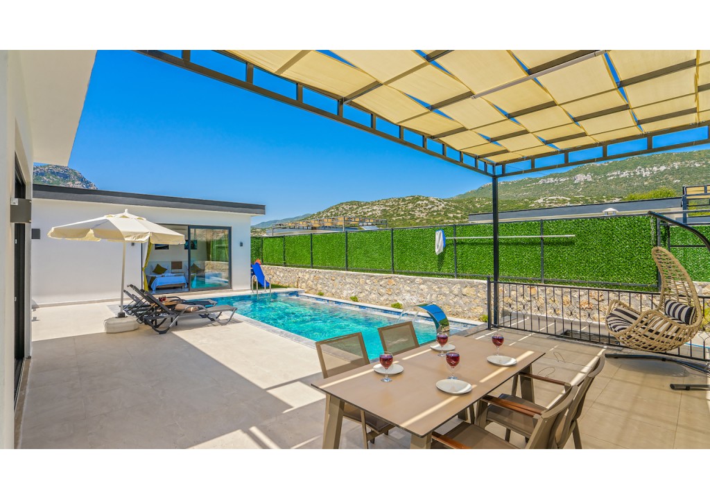 Detayları; Şezlonglar, güneş şemsiyesi, 4 kişilik yemek masası, oturma grubu.