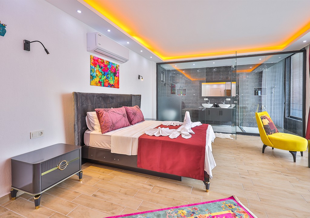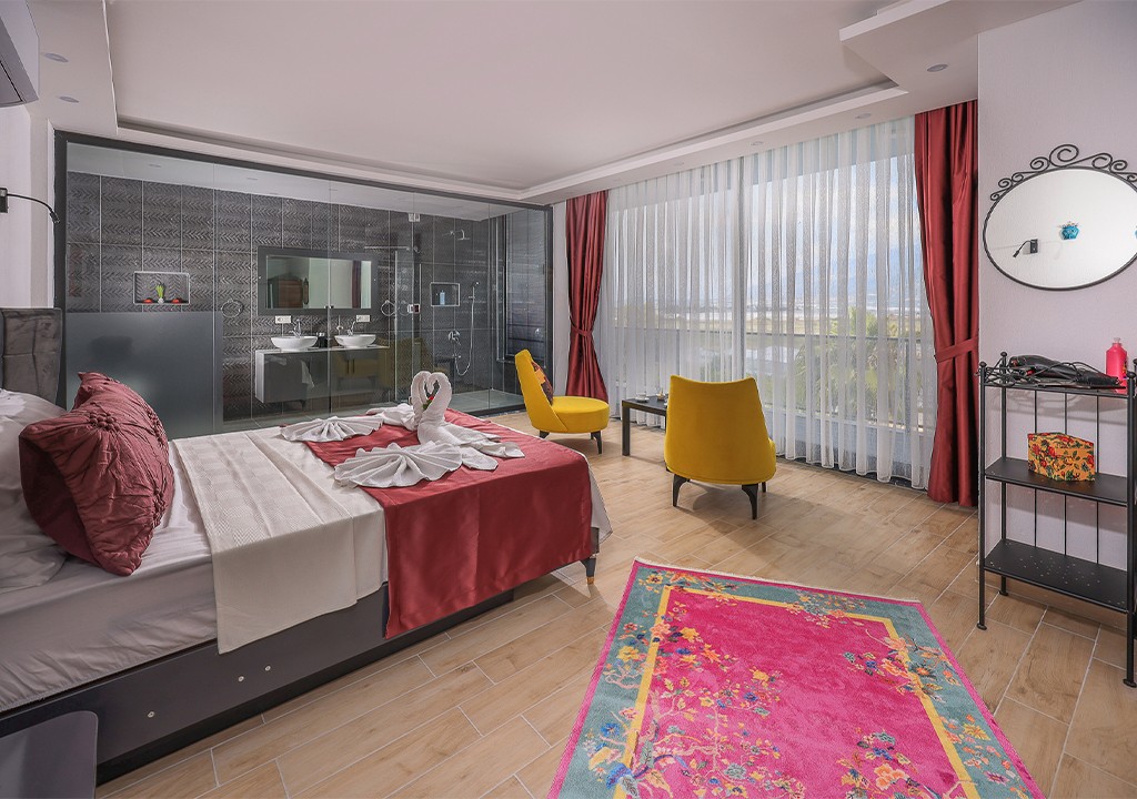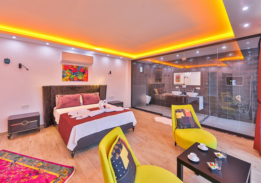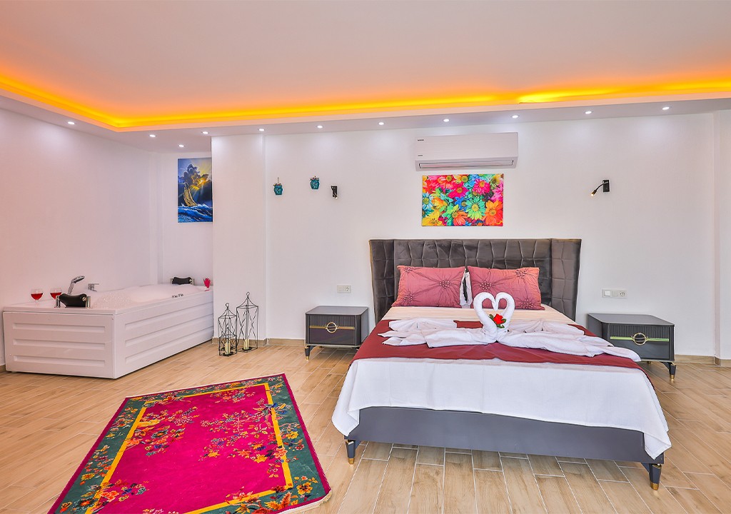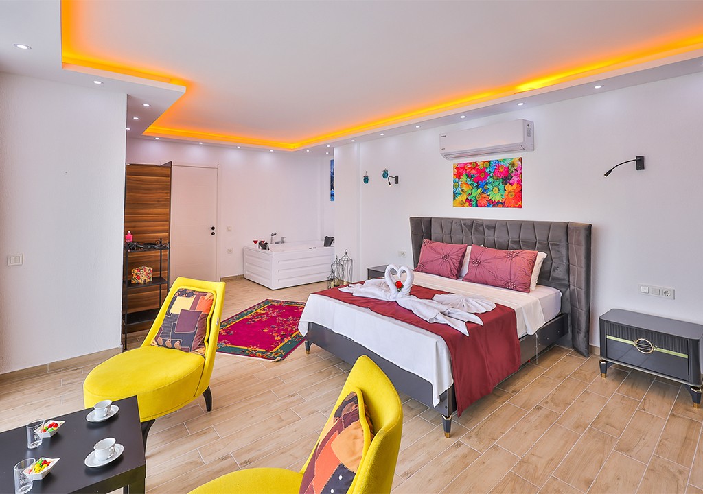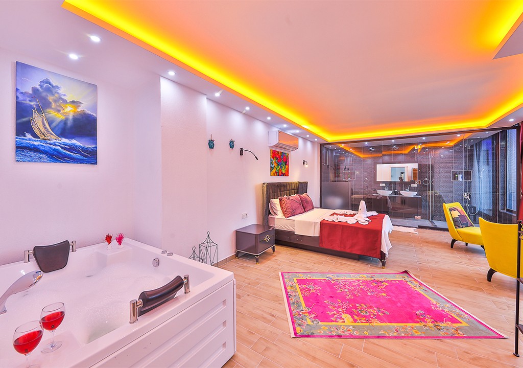 Detayları; Çift kişilik yatak, makyaj masası, komidin, klima, elbise dolabı, jakuzi, banyo ve tuvalet bulunmaktadır.