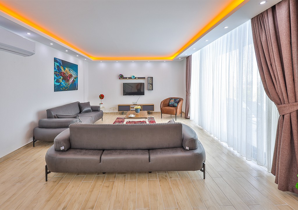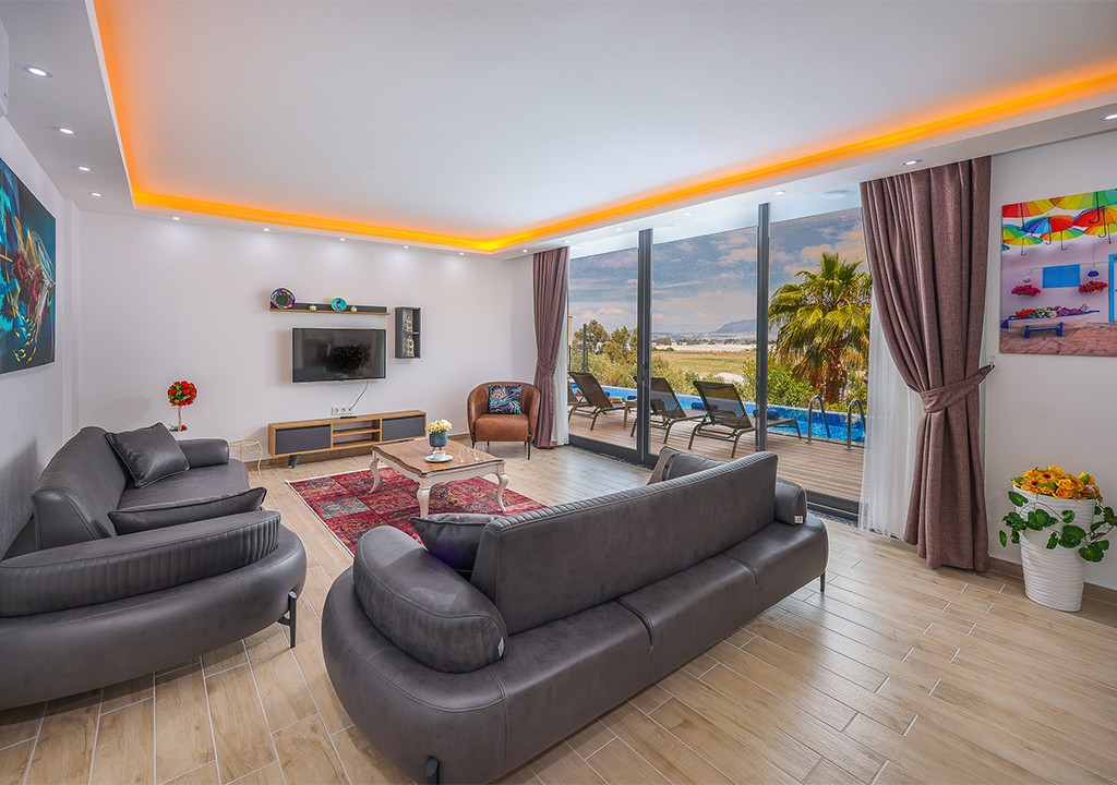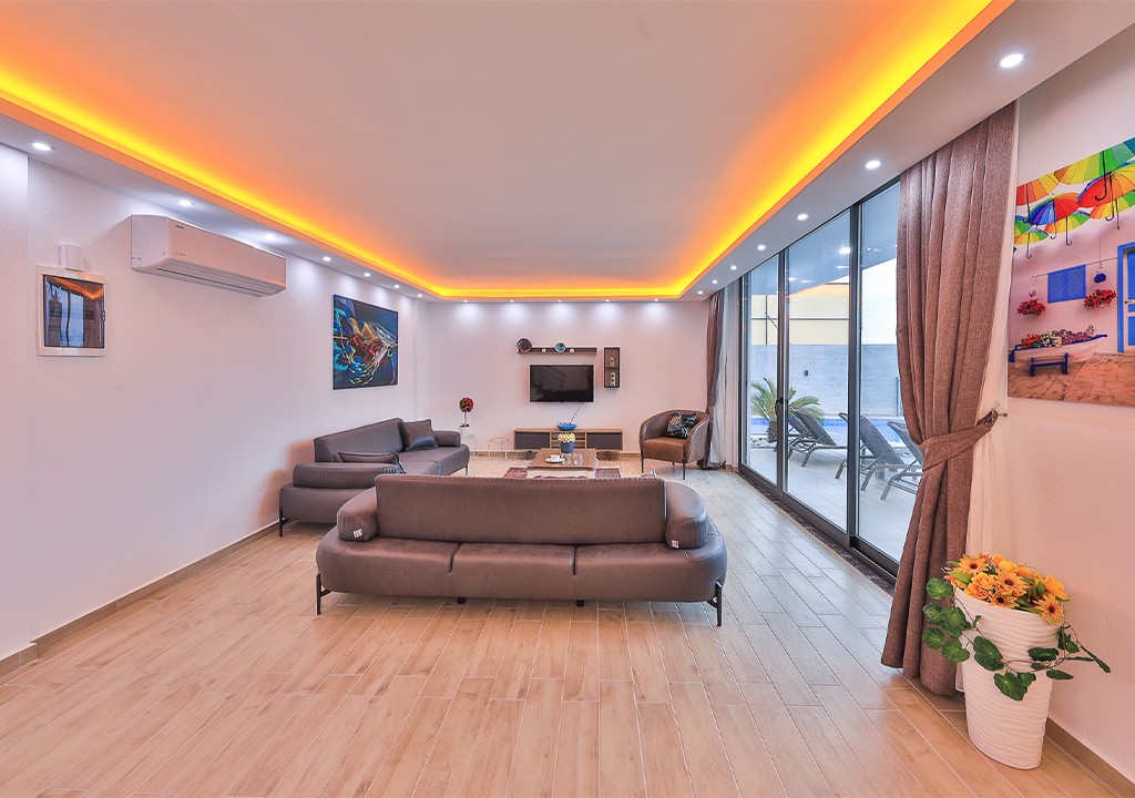 Detayları; Oturma grubu, uydu TV, klima, yemek masası ve havuz terasına çıkış bulunmaktadır.