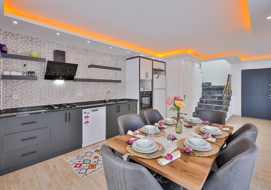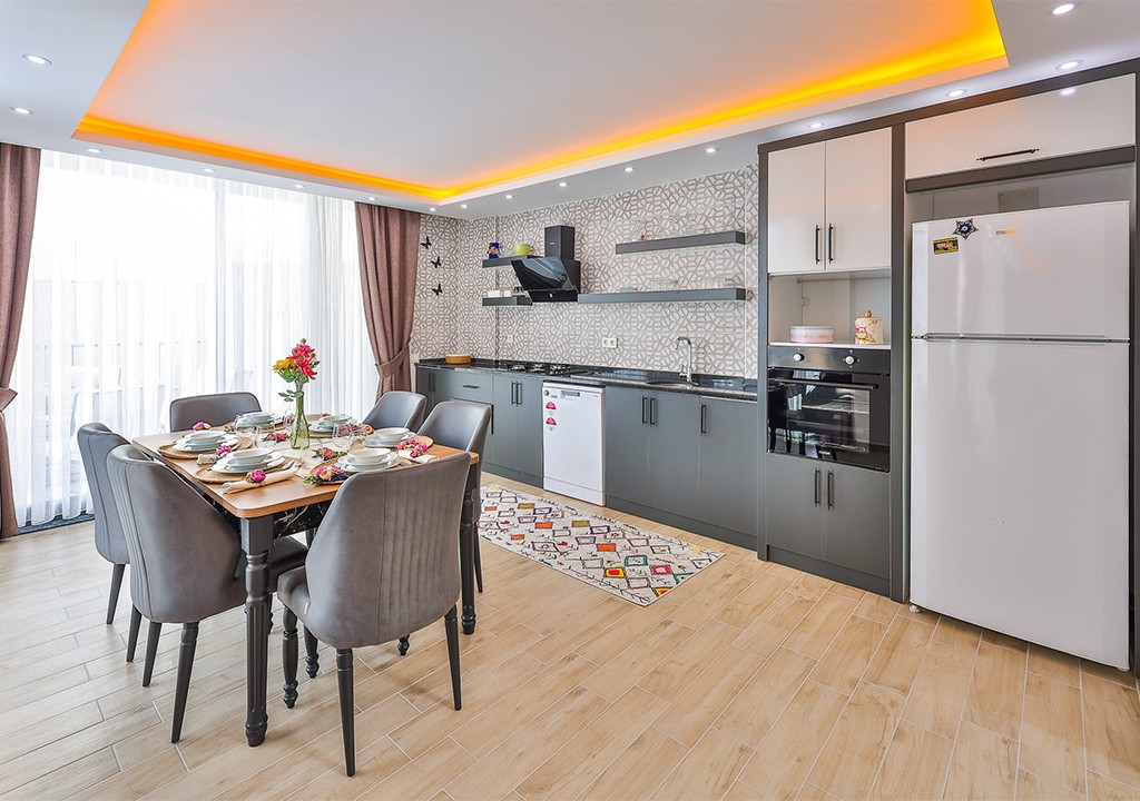 Detayları; Buzdolabı, bulaşık makinesi, fırın, 4’lü ocak, mikrodalga fırın, elektrikli su ısıtıcı, yemek takımı, tava, tencereler, çatal bıçak ve mutfak ekipmanları bulunmaktadır.