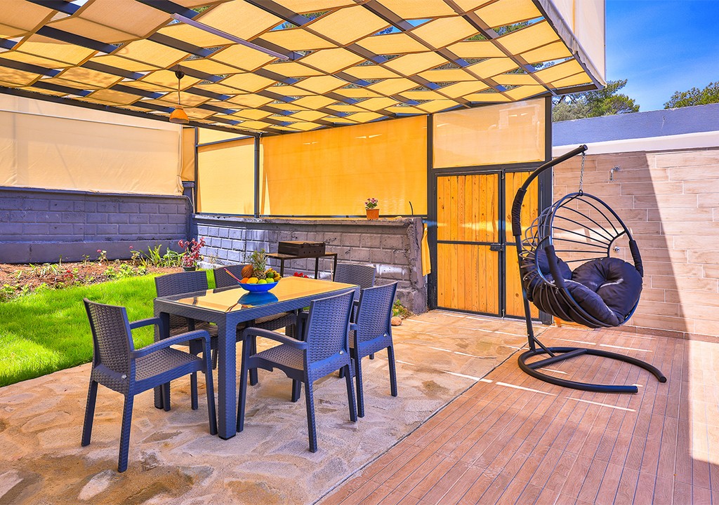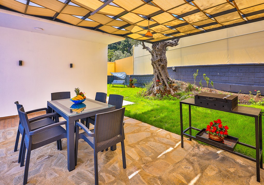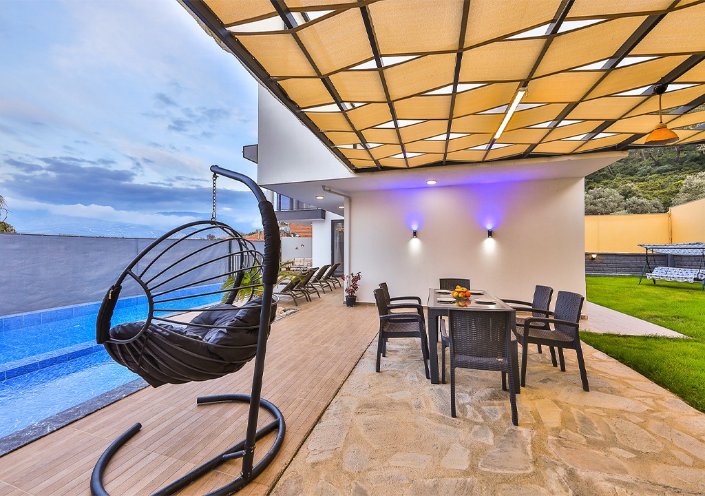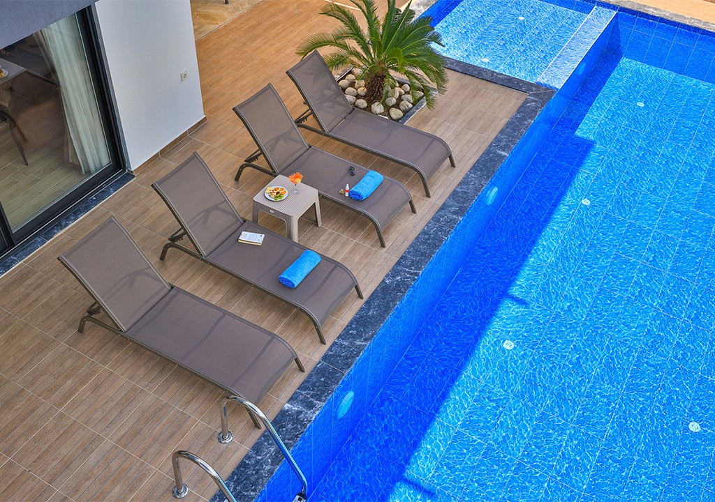 Detayları; Şezlonglar, güneş şemsiyeleri, yemek masası ve oturma grubu bulunmaktadır.
