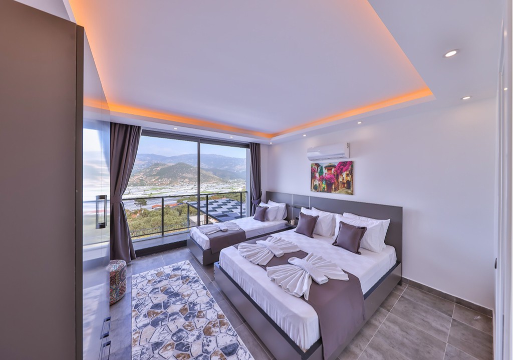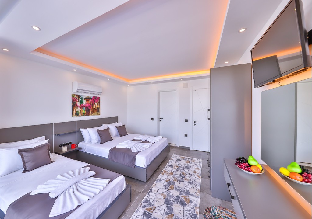 Detayları; Bir adet çift kişilik yatak, bir adet tek kişilik yatak, klima, komodin, elbise dolabı, makyaj masası, banyo ve tuvalet bulunmaktadır.