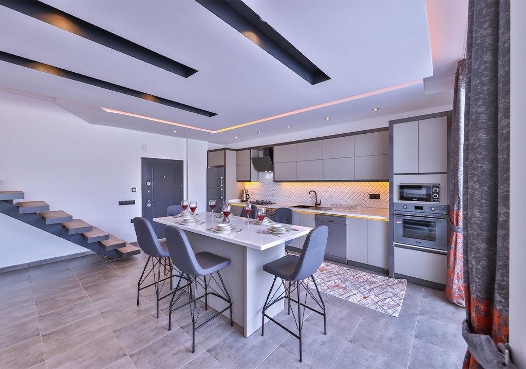 Detayları; Buz dolabı, Bulaşık makinesi, Fırın 4’lü Ocak (ankastre), Mikrodalga fırın, Elektrikli su ısıtıcı, su sebili, 4 kişilik yemek takımı, Tava, Tencereler, Çatal bıçak vb.