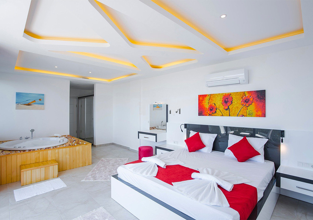 Detayları; Çift kişilik yatak , klima, komodin, elbise dolabı, jakuzi banyo ve lavabo bulunmaktadır.