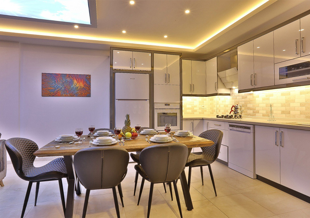 Detayları; Buz dolabı, Bulaşık makinesi, Fırın 4’lü Ocak (ankastre), Mikrodalga fırın, Elektrikli su ısıtıcı, su sebili, 4 kişilik yemek takımı, Tava, Tencereler, Çatal bıçak vb.