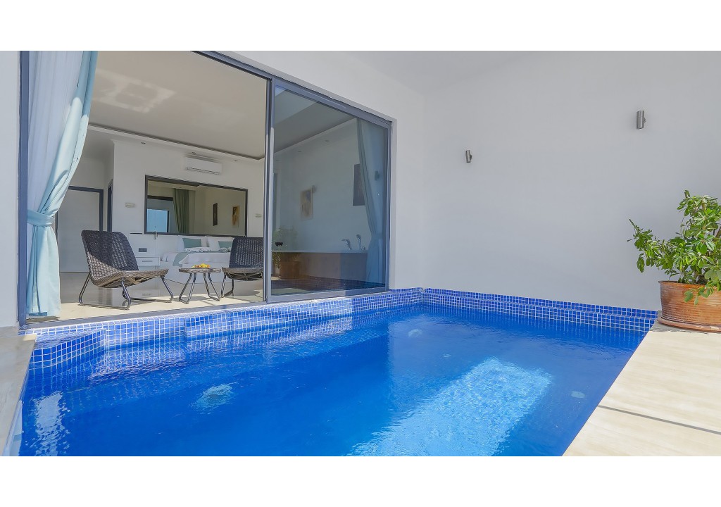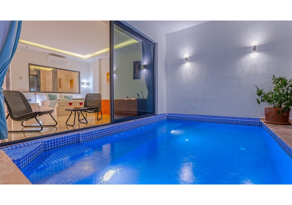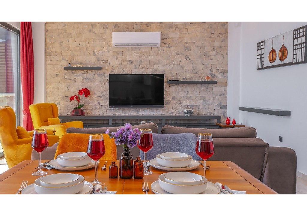 Detayları; Oturma grubu, uydu TV, klima, yemek masası ve havuz terasına çıkış bulunmaktadır.