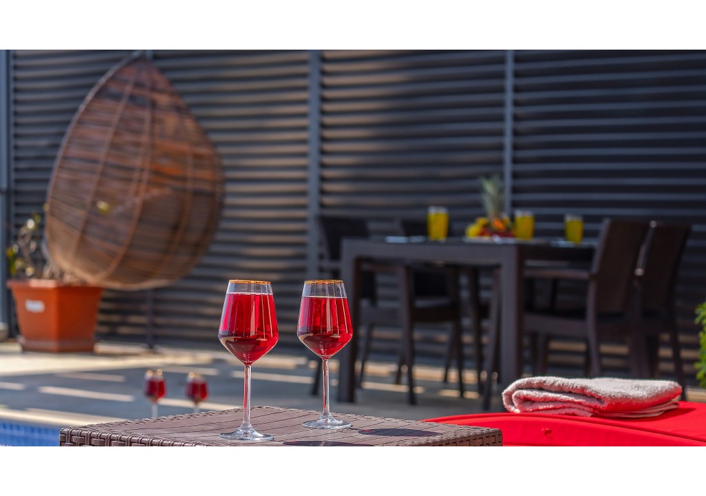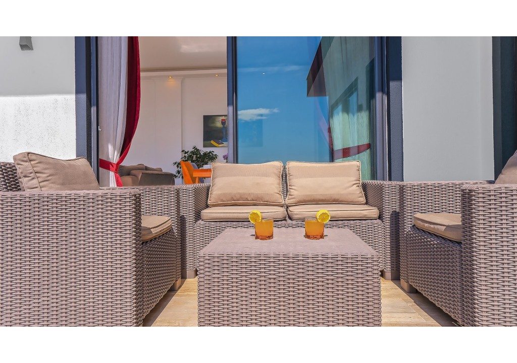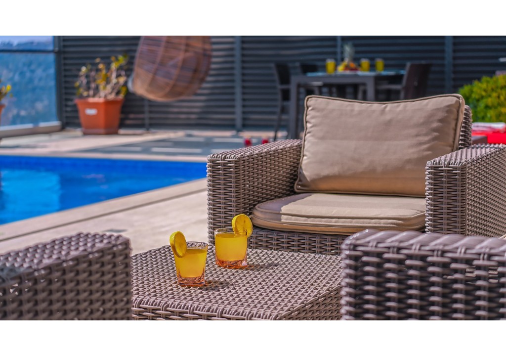 Detayları; Şezlonglar, güneş şemsiyeleri, yemek masası ve oturma grubu bulunmaktadır.